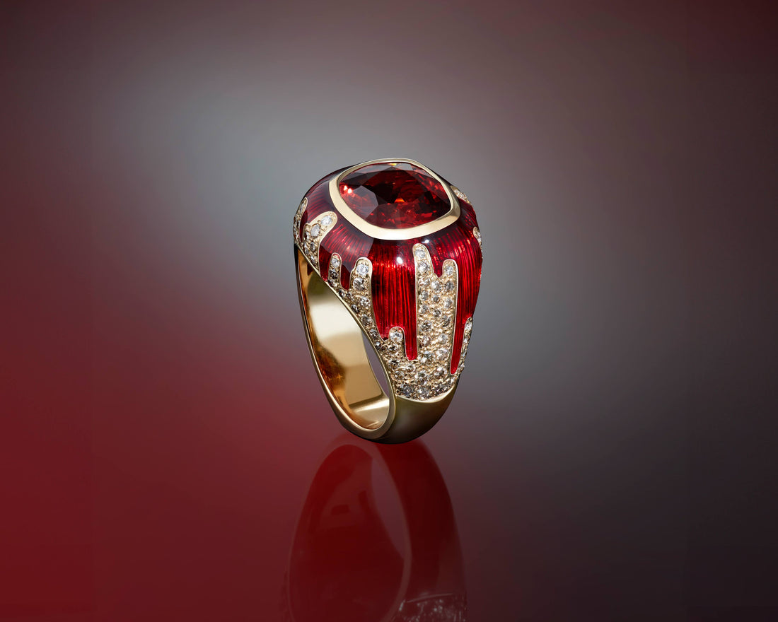 The Full Bleed Cocktail Ring features a dramatic central Orangy Red Spinel, with tonal blends of enamel, creating the illusion of the gemstone ‘bleeding’ colour down the shank. This one-of-a-kind Ring is handcrafted in 18 carat recycled Yellow Gold, and set with graduating White and Brown Diamonds.