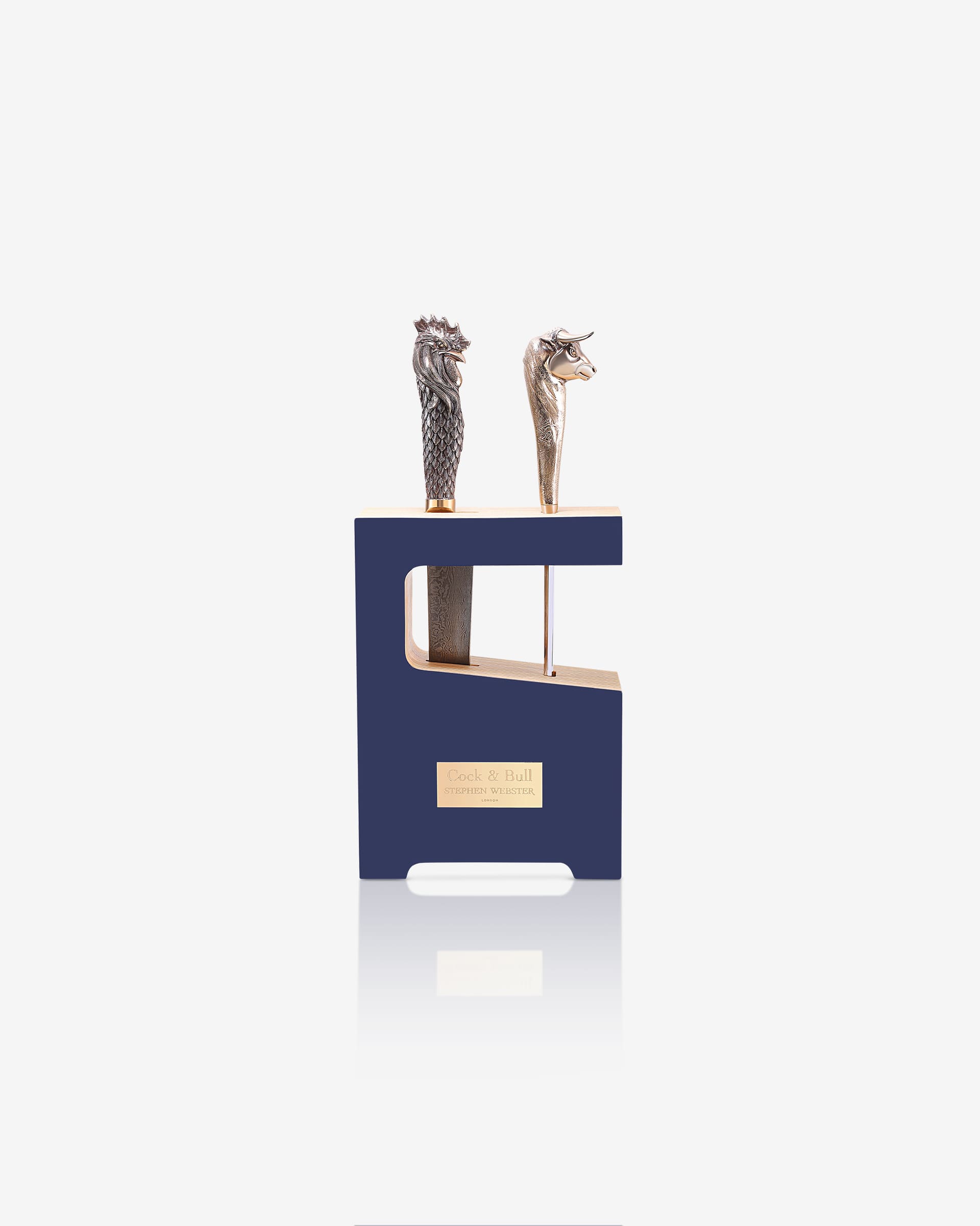 Cock and Bull Carving Set and knife block (as seen in limited edition blue) - Featuring a bronze cock head handle with Damascus steel knife and bronze bull head handle with stainless steel fork.