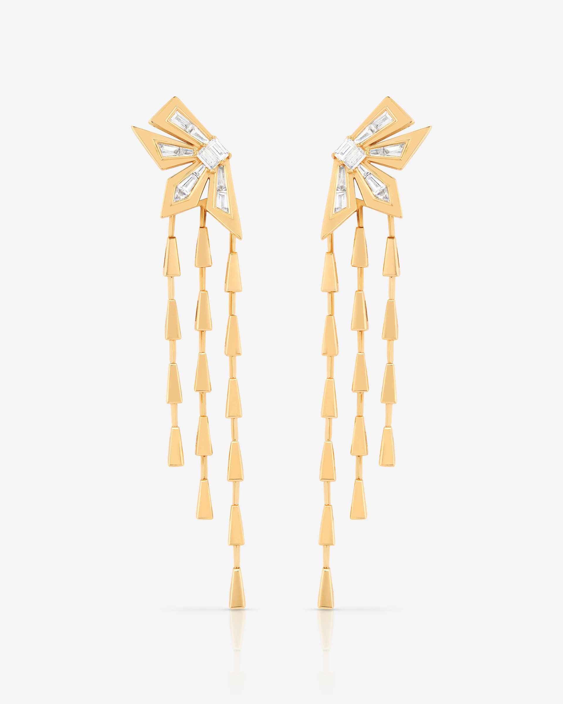 Taking inspiration from fragments of post-modern architecture, Stephen Webster presents the Dynamite Cascade Earrings set in 18ct yellow gold, with tapered white diamond baguettes and central white diamond baguettes .