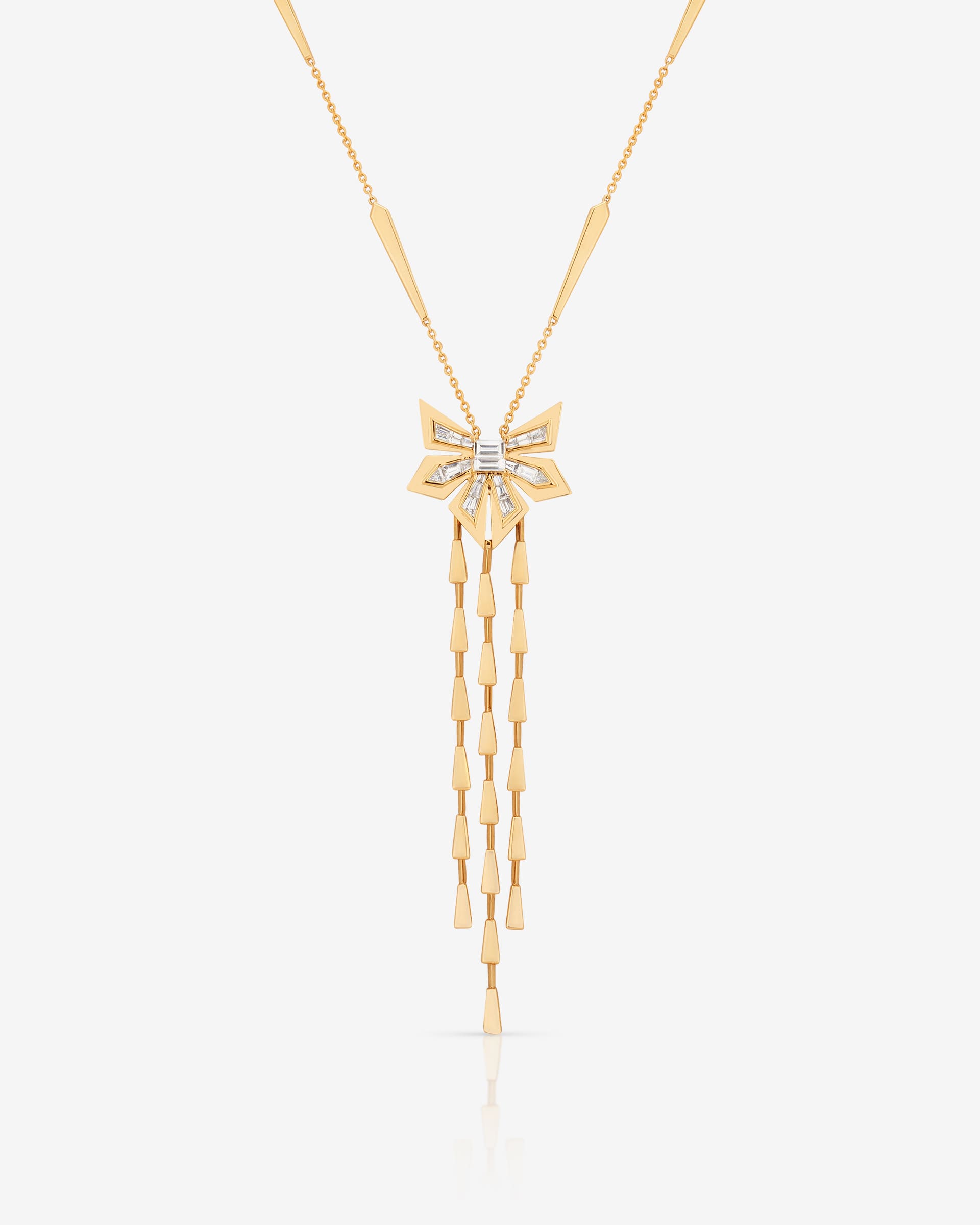 Captivating the asymmetrical forms of post-modernism architecture, Stephen Webster introduces the Dynamite Cascade Necklace. Set in 18ct yellow gold, with tapered white diamond baguettes and central white diamond baguettes.