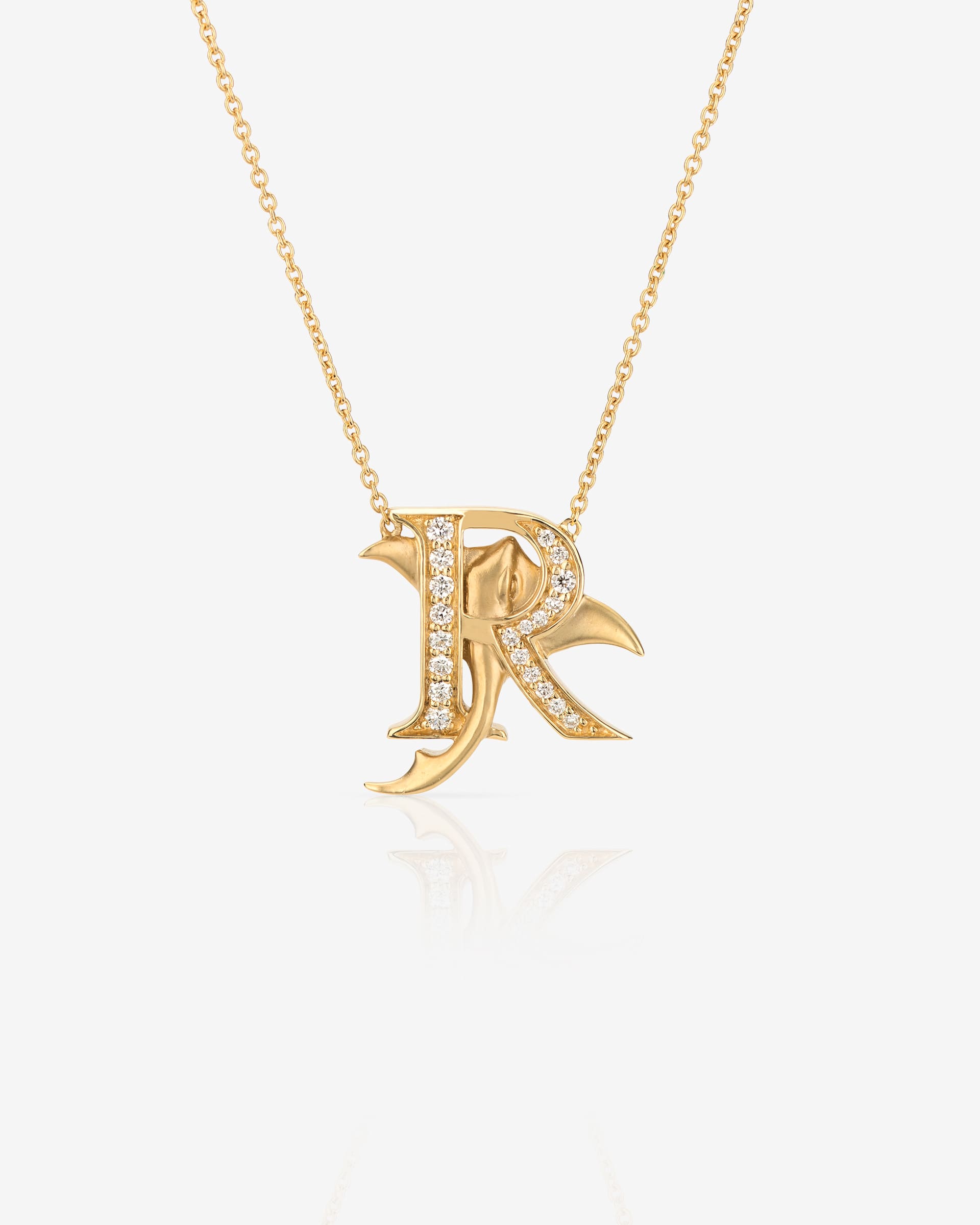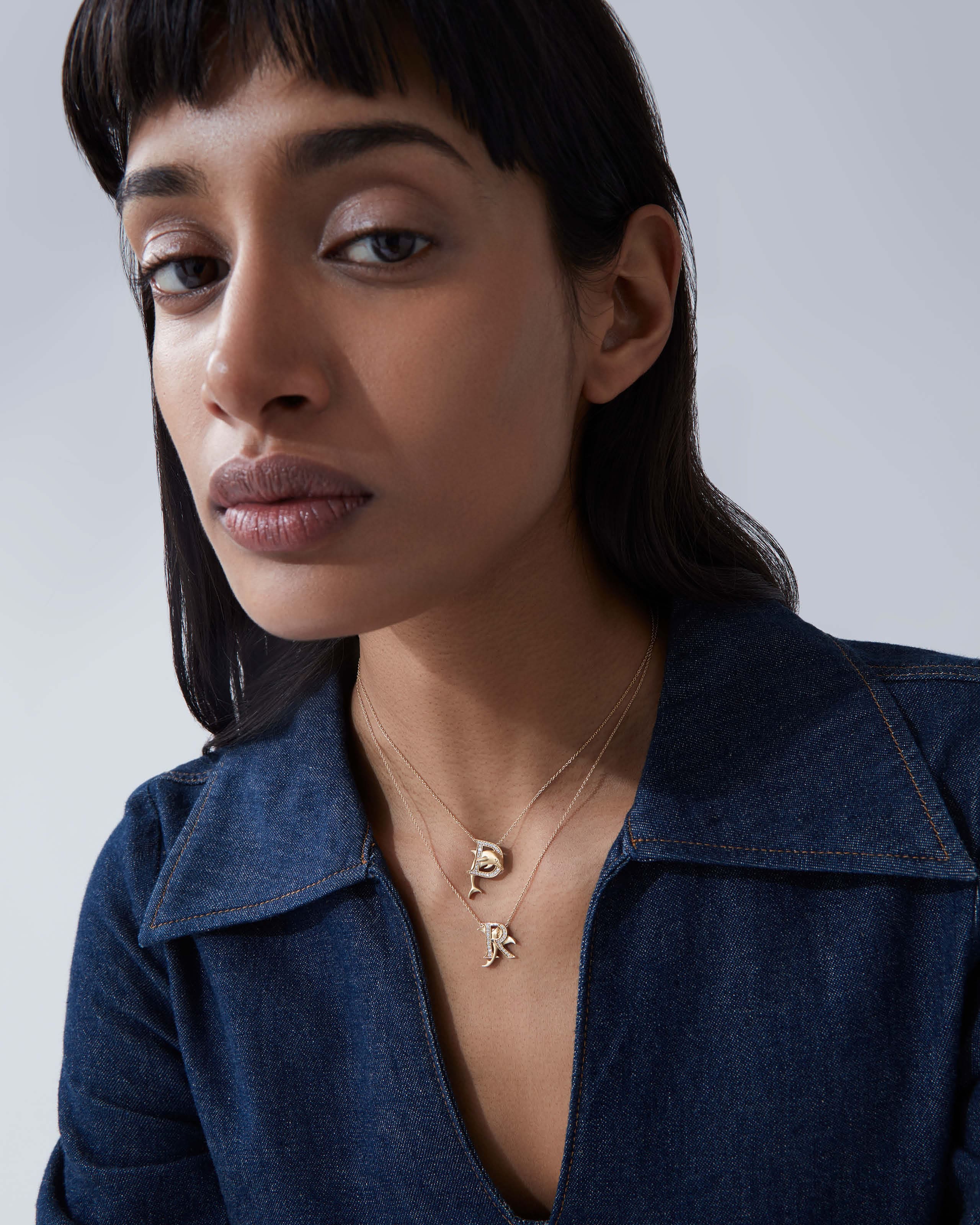 Drawing on a life-long fascination with the underwater world, Webster has created the 'R is for Ray' diamond letter necklace. Set a 42cm gold chain it features a matt finish ray fish intertwined within an 18ct yellow gold and white round diamond letter R. Each necklace is accompanied by 'Fish Tales' the book where Stephen Webster takes the reader on a glorious journey below the waterline, introducing you to some of the characters that inhabit the mysterious marine landscape.