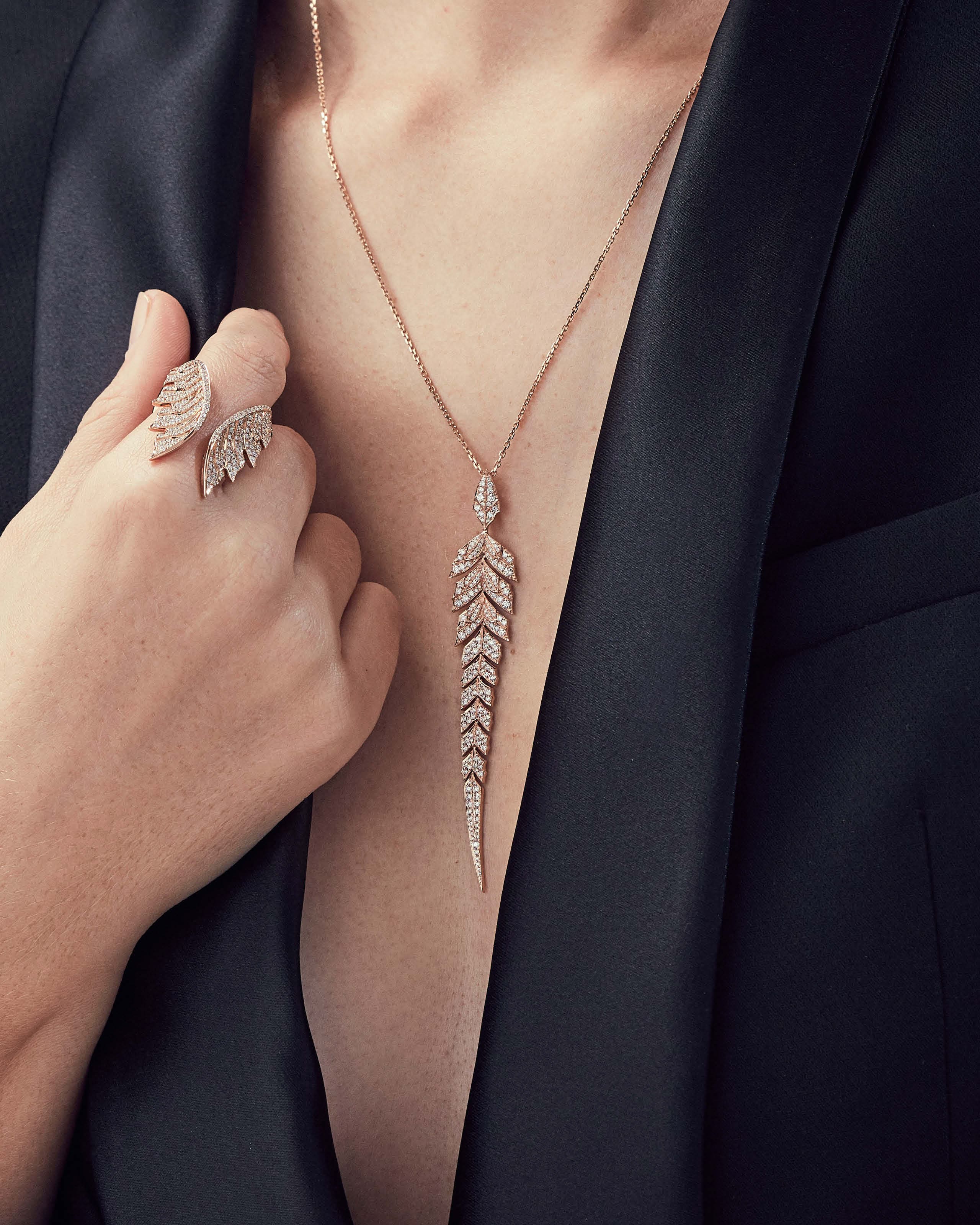 Depicting the magnificent English pheasant, the Tail Feather Long Drop Pendant exemplifies nature’s beauty with White Diamond pavé on articulated feather segments.