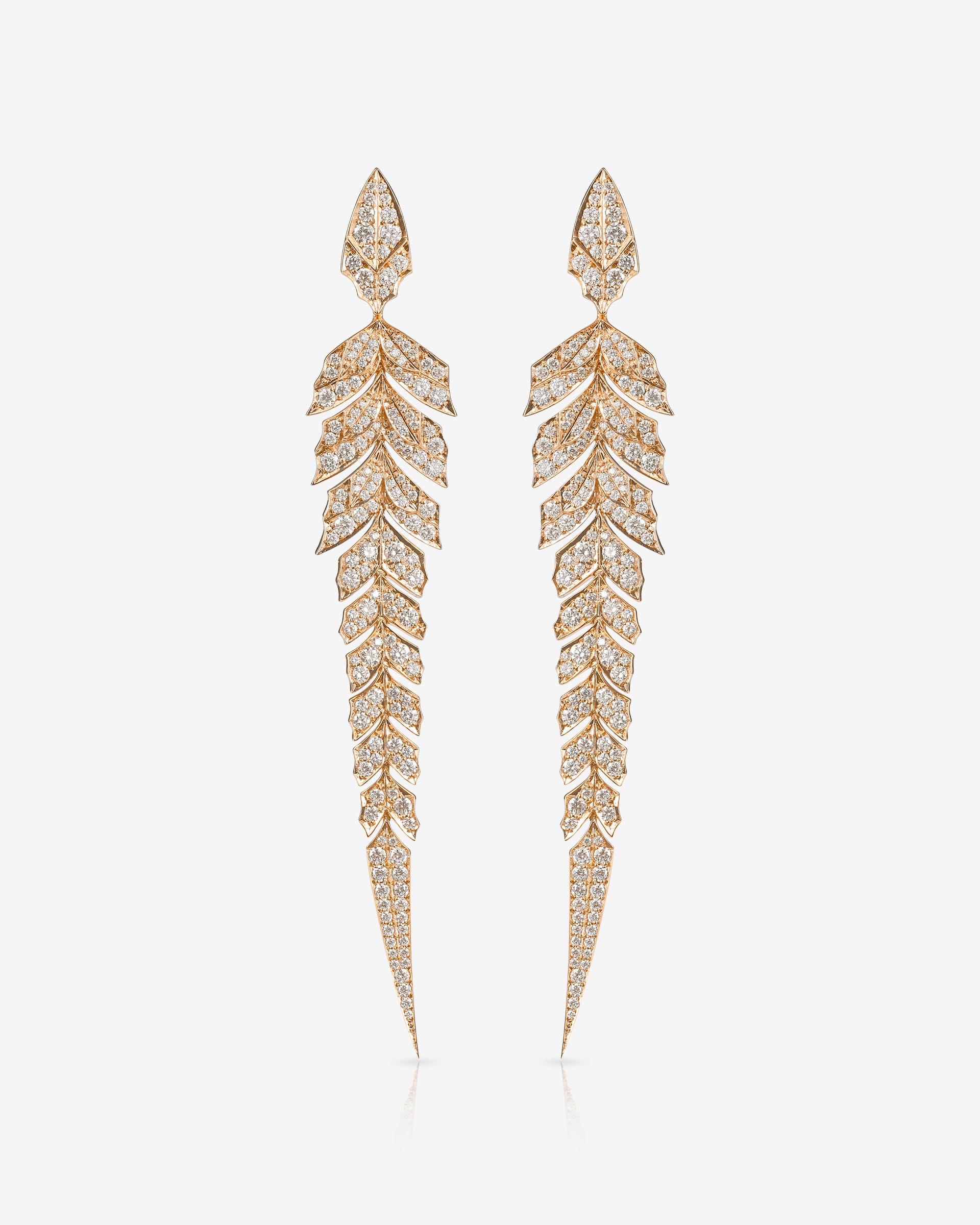 The timeless and glamorous Tail Feather Long Drop Earrings embody the magnificent pheasant's tail set with White Diamond pavé on articulated feather segments for alluring movement.