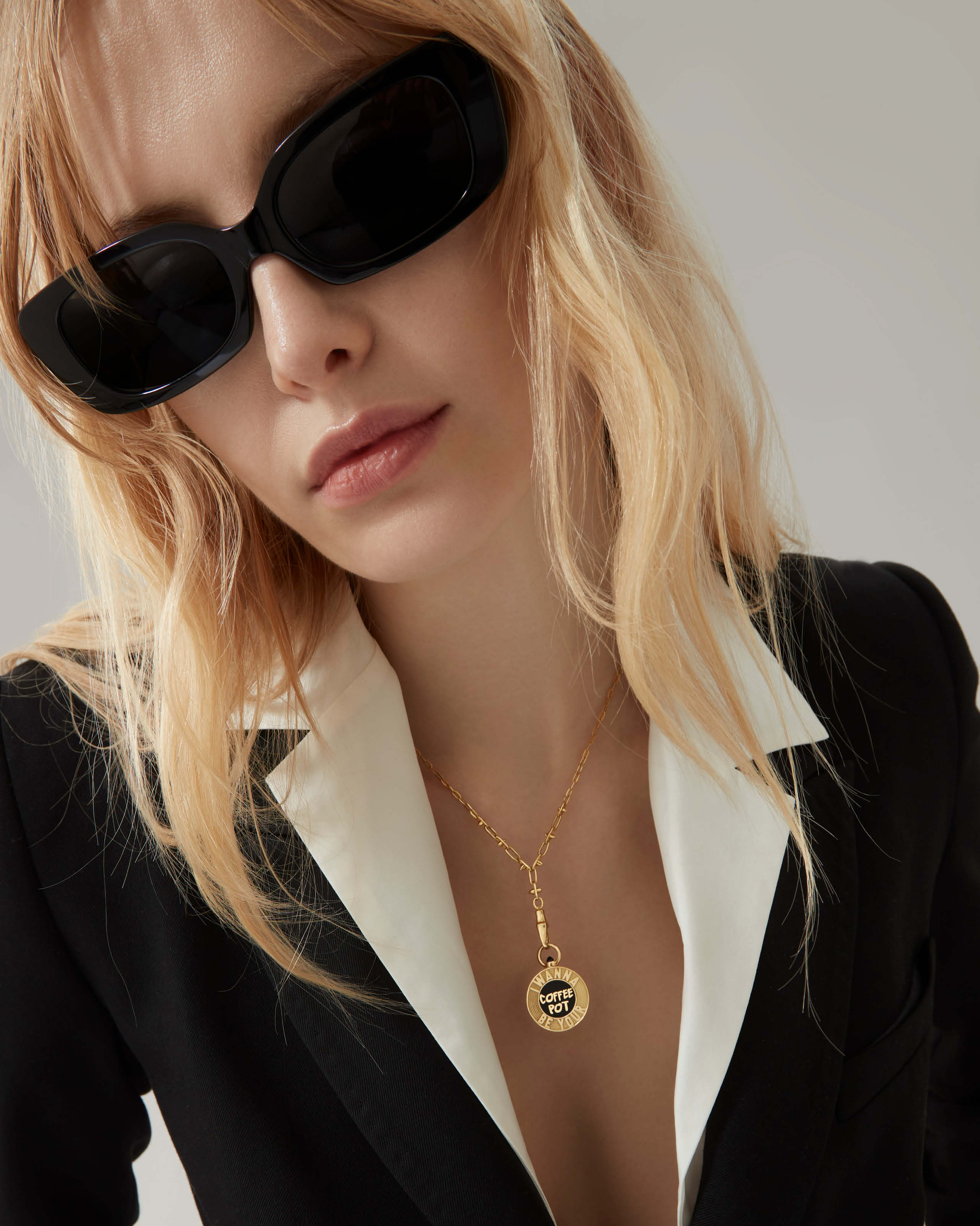Handcrafted in 18 carat Gold, much like a vinyl record this flip-pendant features an A side outer of 'I Wanna Be Your' with 'Coffee Pot' etched into a Black Onyx Enamel centre. The B side has a Translucent Black Enamel vinyl outer with the words 'You Call The Shots' etched into the centre.