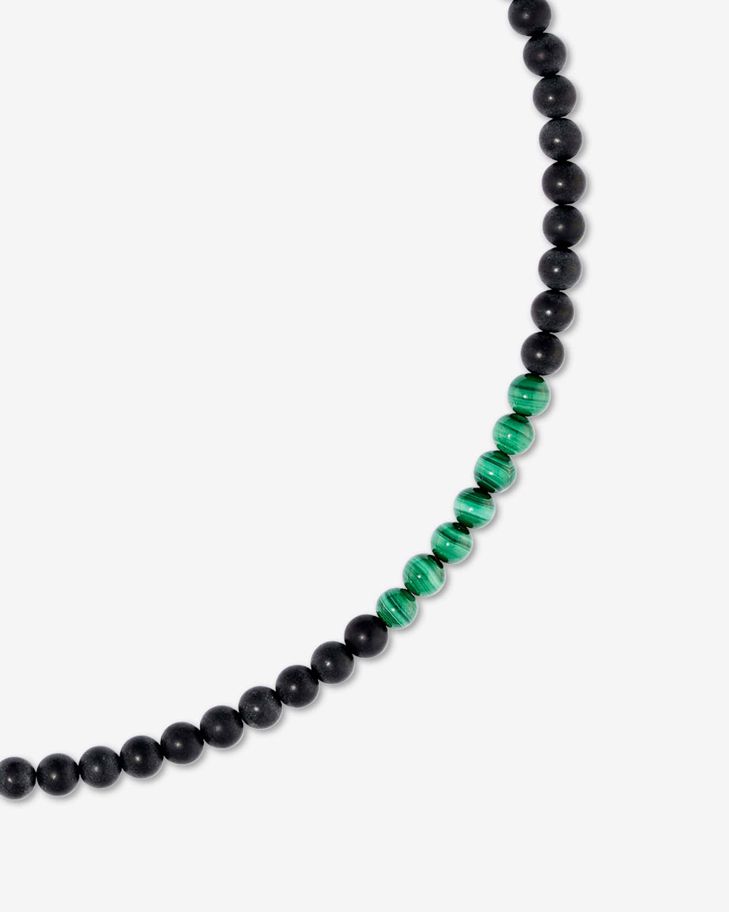 Adding a pop of colour the Thorn Beaded Necklace features Matt Black Onyx and an asymmetric detail of Malachite beads with a Sterling Silver clasp.