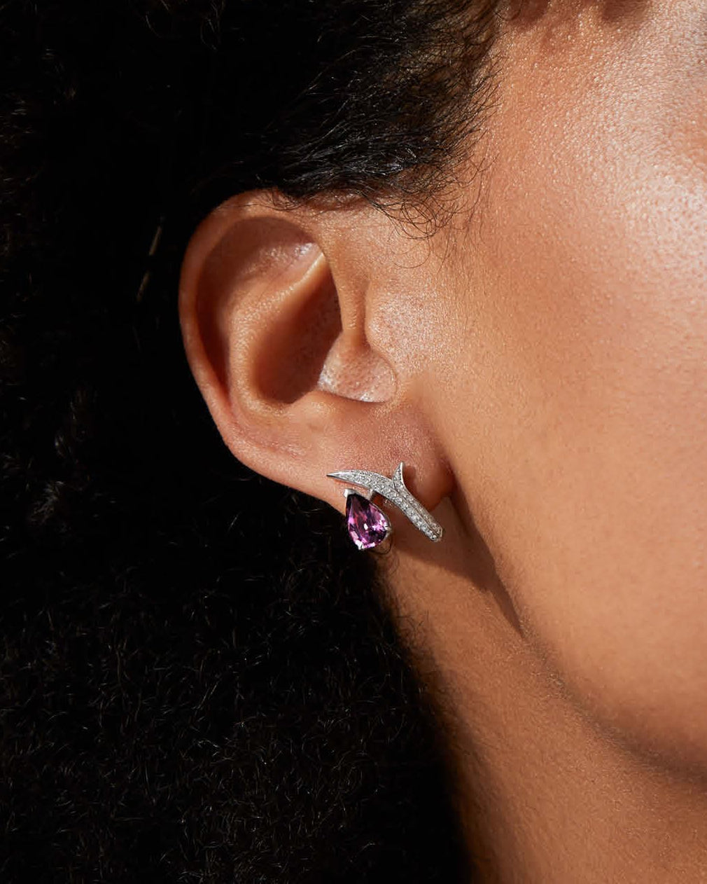 Combining Webster's long addiction to the 'thorn' and using alternative gemstones in his pieces, the Pear Studs are set with a pair of Raspberry Spinels encompassed by white Diamond pavé thorns handcrafted in 18ct White Gold.
