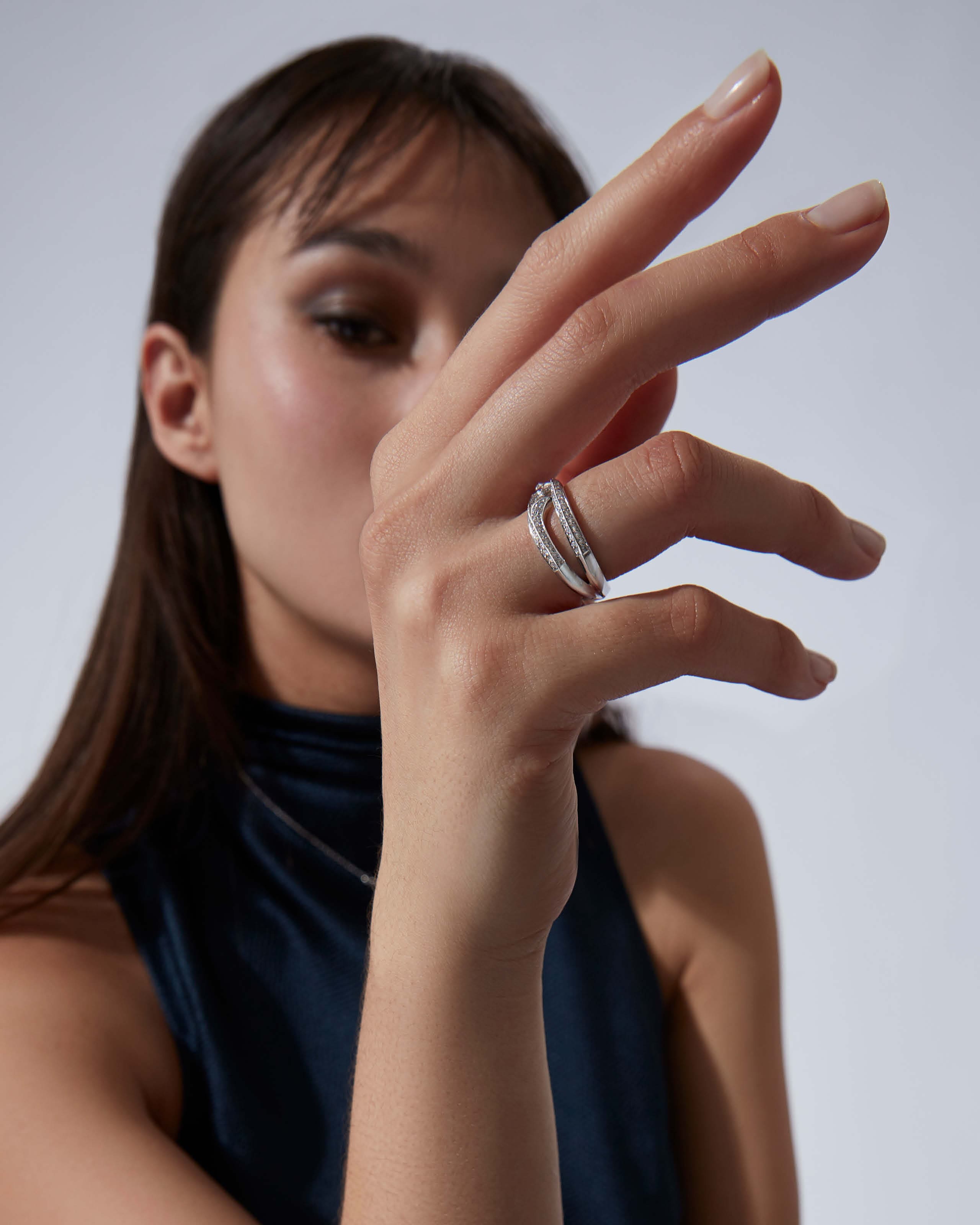 The Bound Together Narrow Band Ring is elegantly captivating, with a trio of twisting thorns in 18ct recycled White Gold, all set with White Diamond pavé.