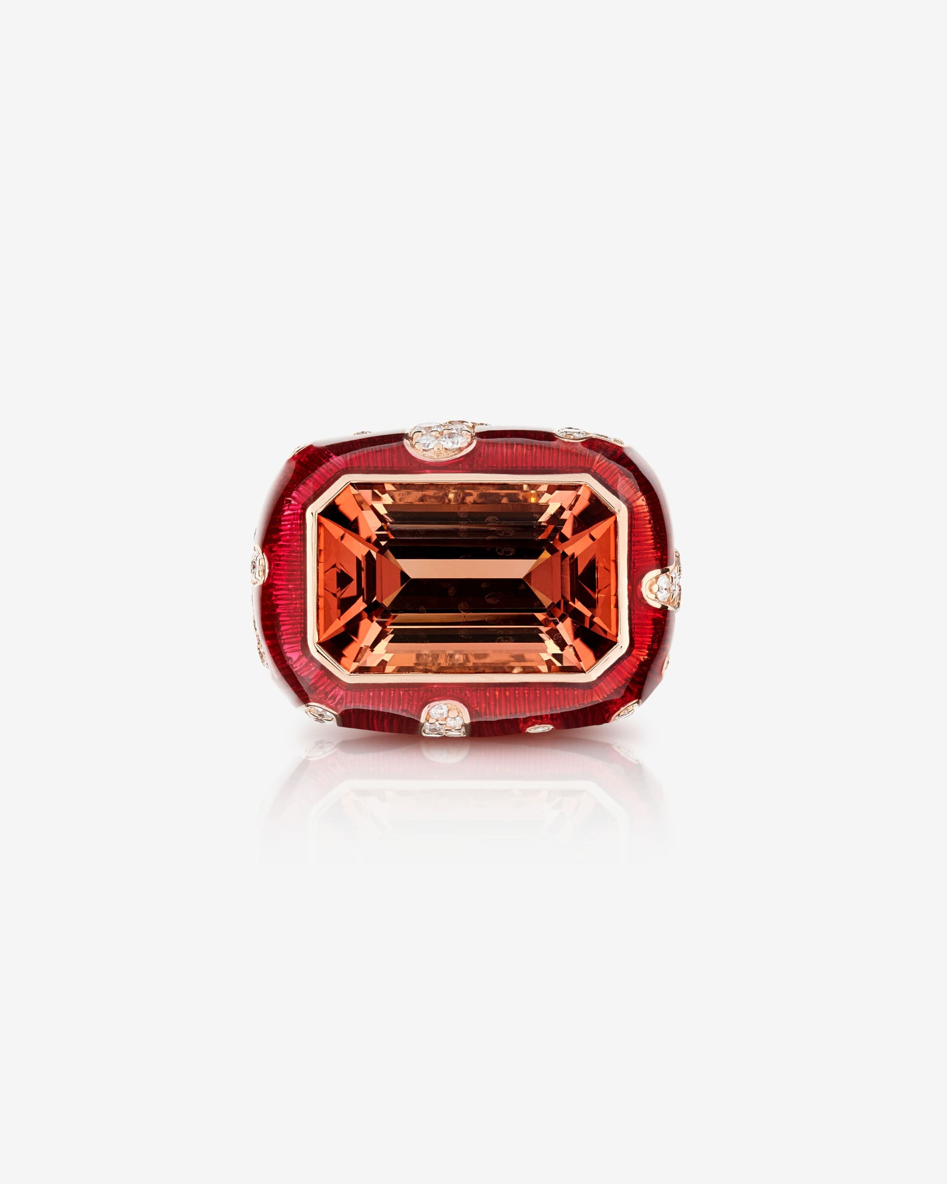 Showcasing the ‘Full Bleed’ ring with a central bi-colour Peach Tourmaline and enamel, set with graduating Brown and White Diamonds and crafted in 18 carat Rose Gold.
