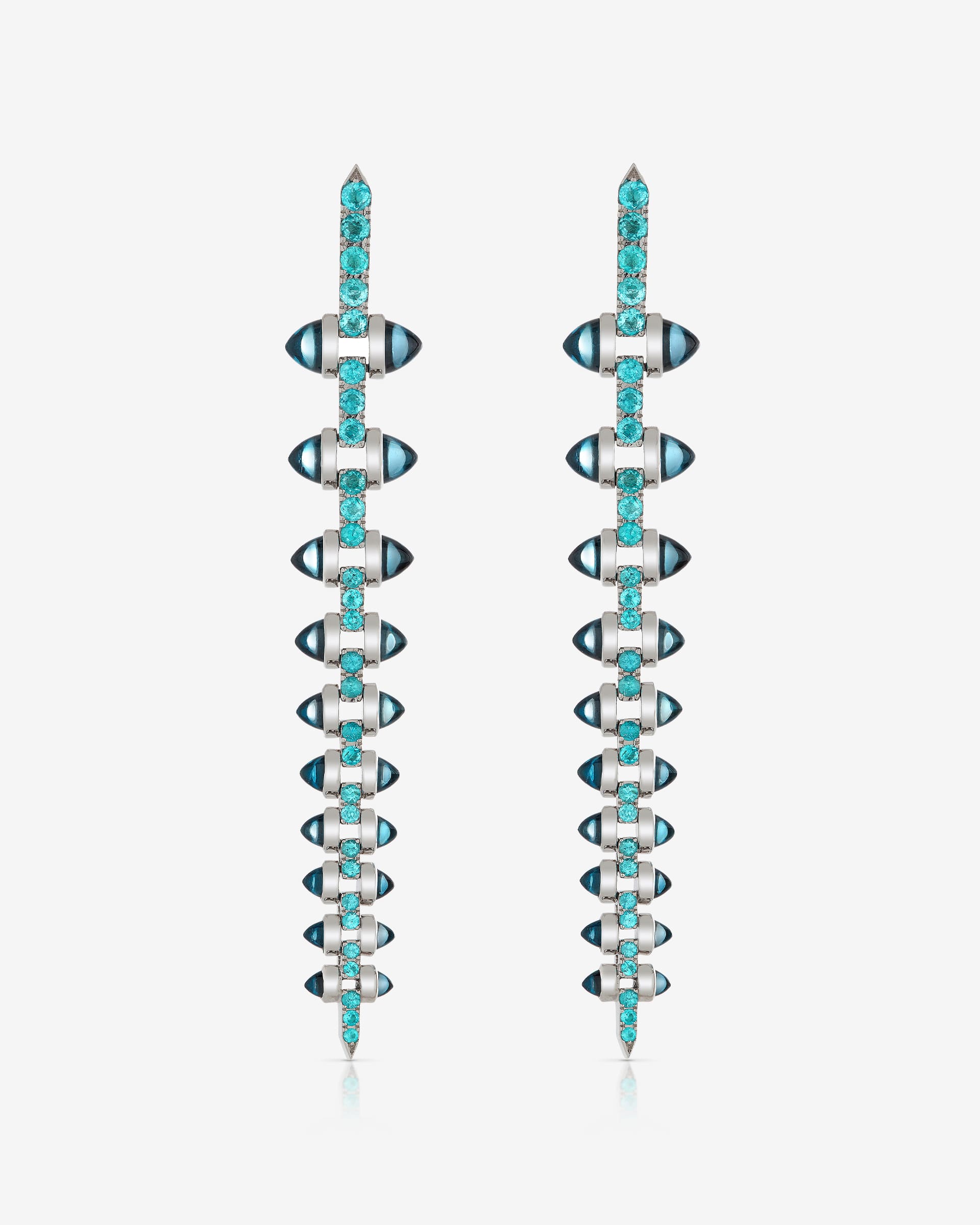 With round Paraiba Tourmalines to add a captivating twist; our Russian Roulette Stiletto Earrings are crafted from 18ct White Gold with London Blue Topaz 'bullets' running down the entire length of the earrings.