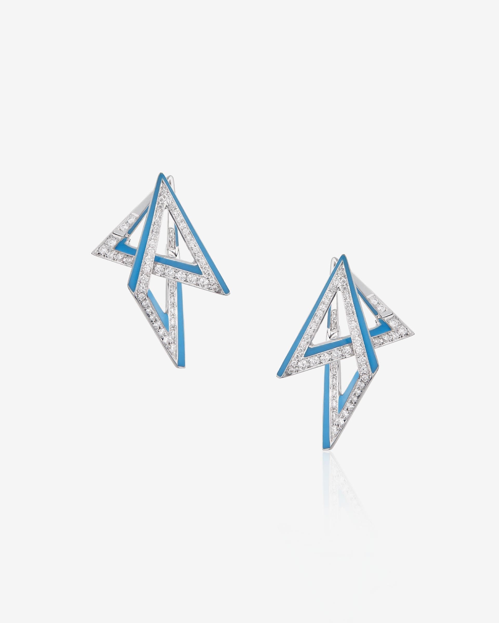 Infinitely linked, the Vertigo Acute Hoops are crafted in 18ct White Gold with Neon Blue enamel and white Diamond pavé, to create an illusion of depth and dimension.
