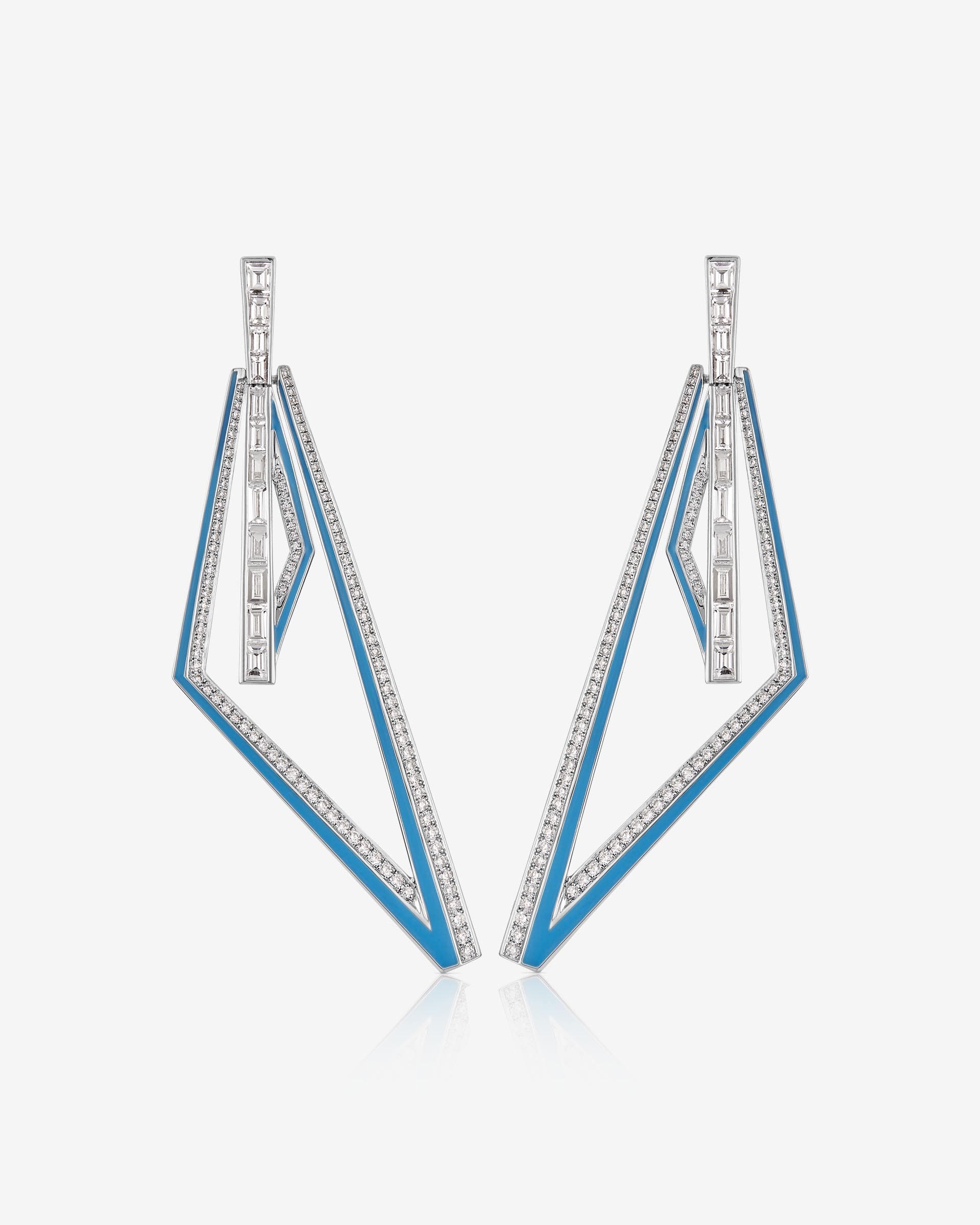 Creating an illusion of depth and dimension; the versatile Vertigo Obtuse Hoops are crafted in 18ct White Gold with eye-catching Neon Blue enamel and accentuated with white baguette Diamonds and white Diamond pavé on a detachable hoop.