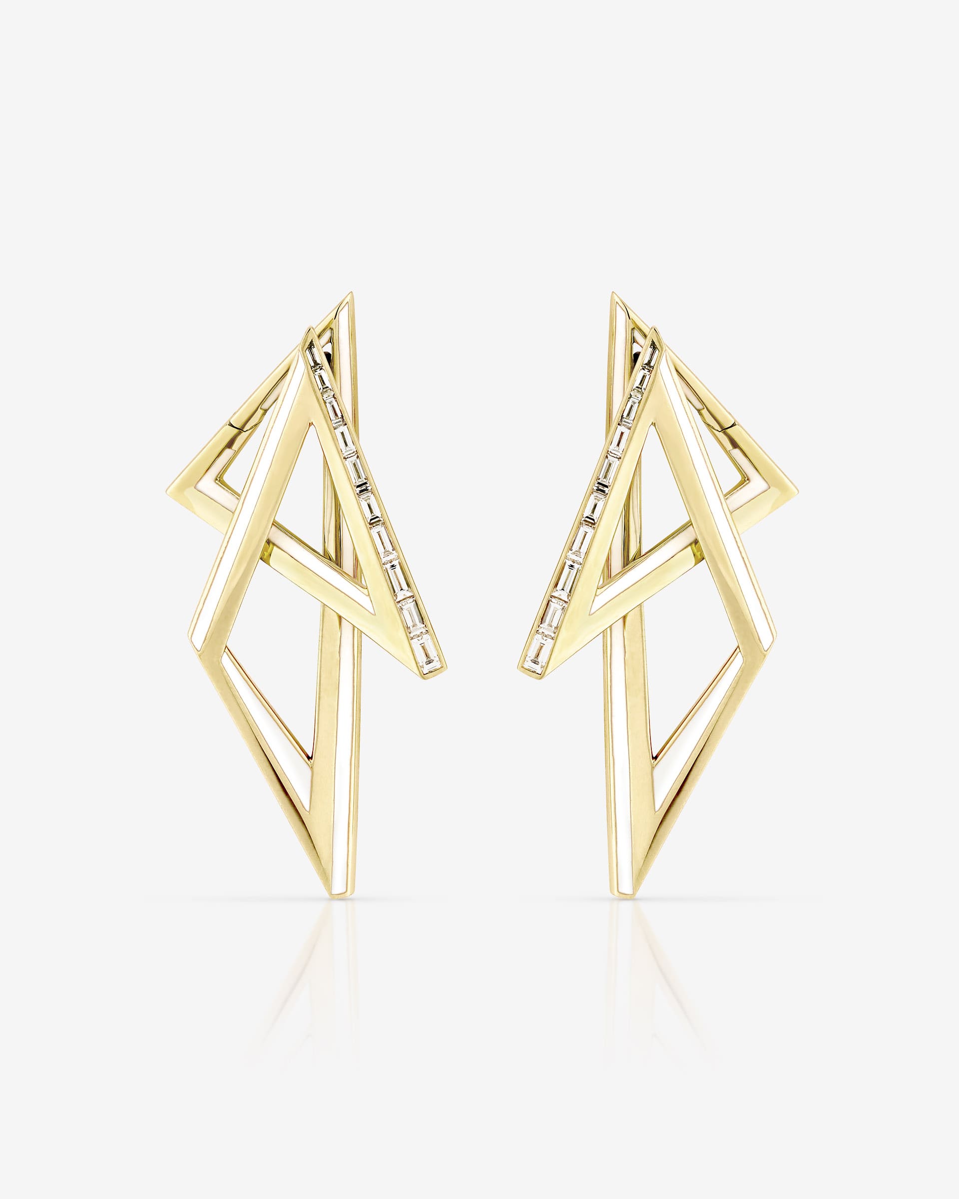 Wrapping infinitely around, the Vertigo Infinity Hoops use 18ct yellow Gold with white enamel and white baguette Diamonds to create their illusion.