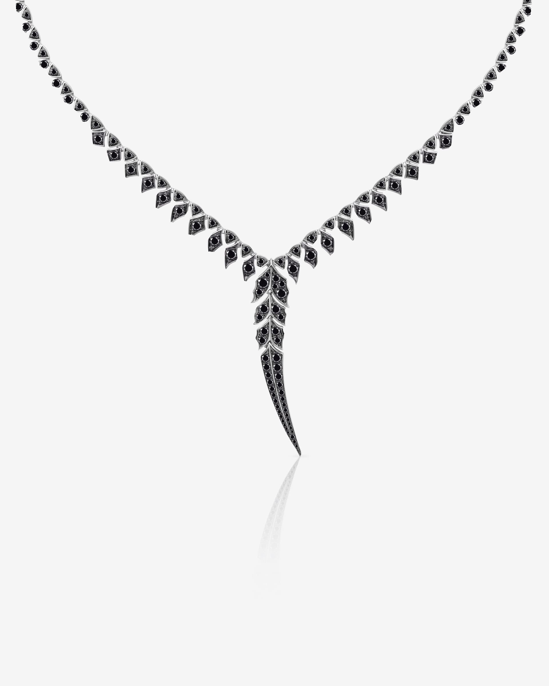 Depicting the English pheasant's spectacular plumage, the Tail Feather Drop Necklace is set in Black Diamonds pavé for a glamourous piece. Layer with the Tail Feather Collar for maximum impact.