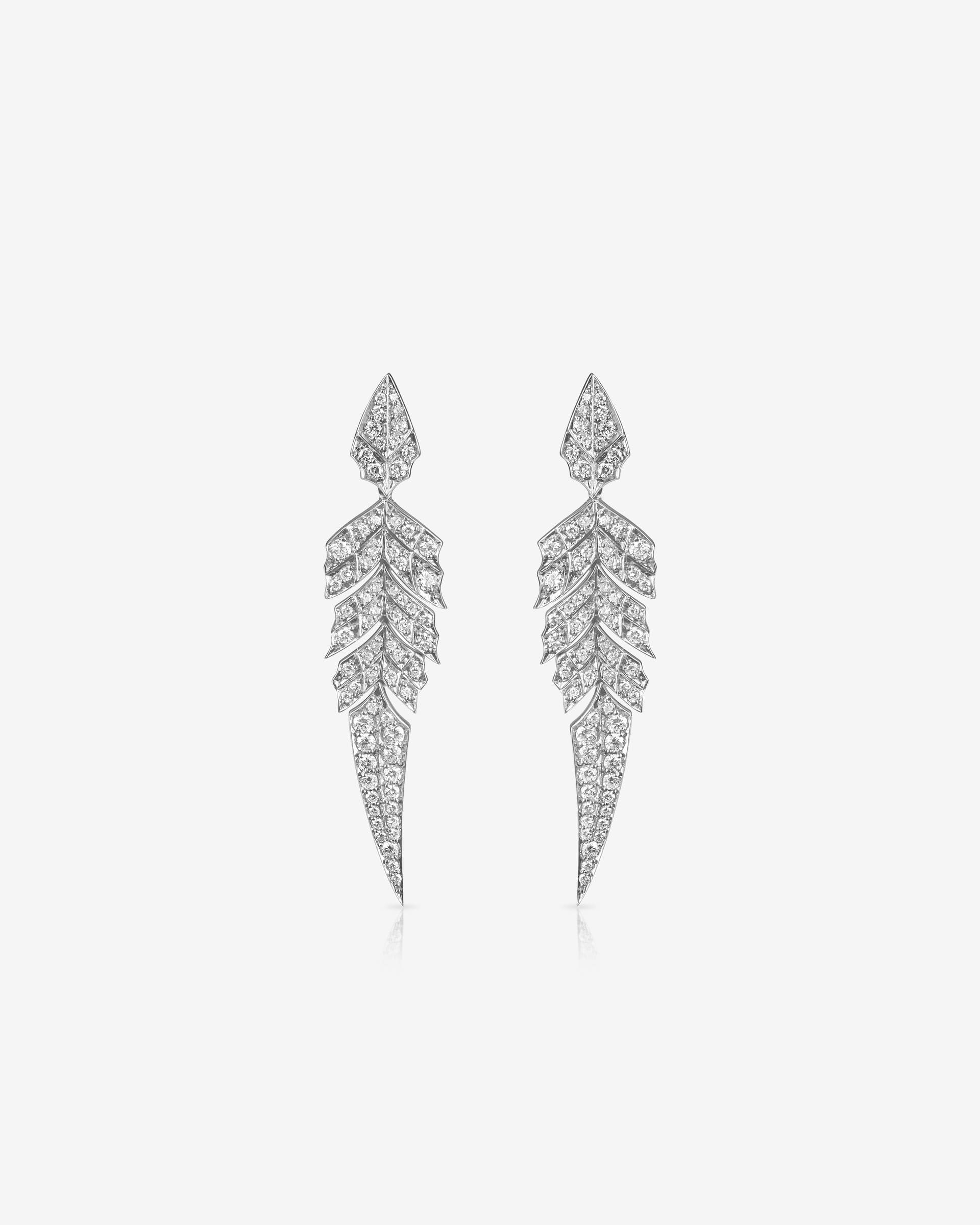 Timeless and elegant; the Tail Feather Drop Earrings embodies the magnificent pheasant's tail with articulated feather segments, set with White Diamond pavé.