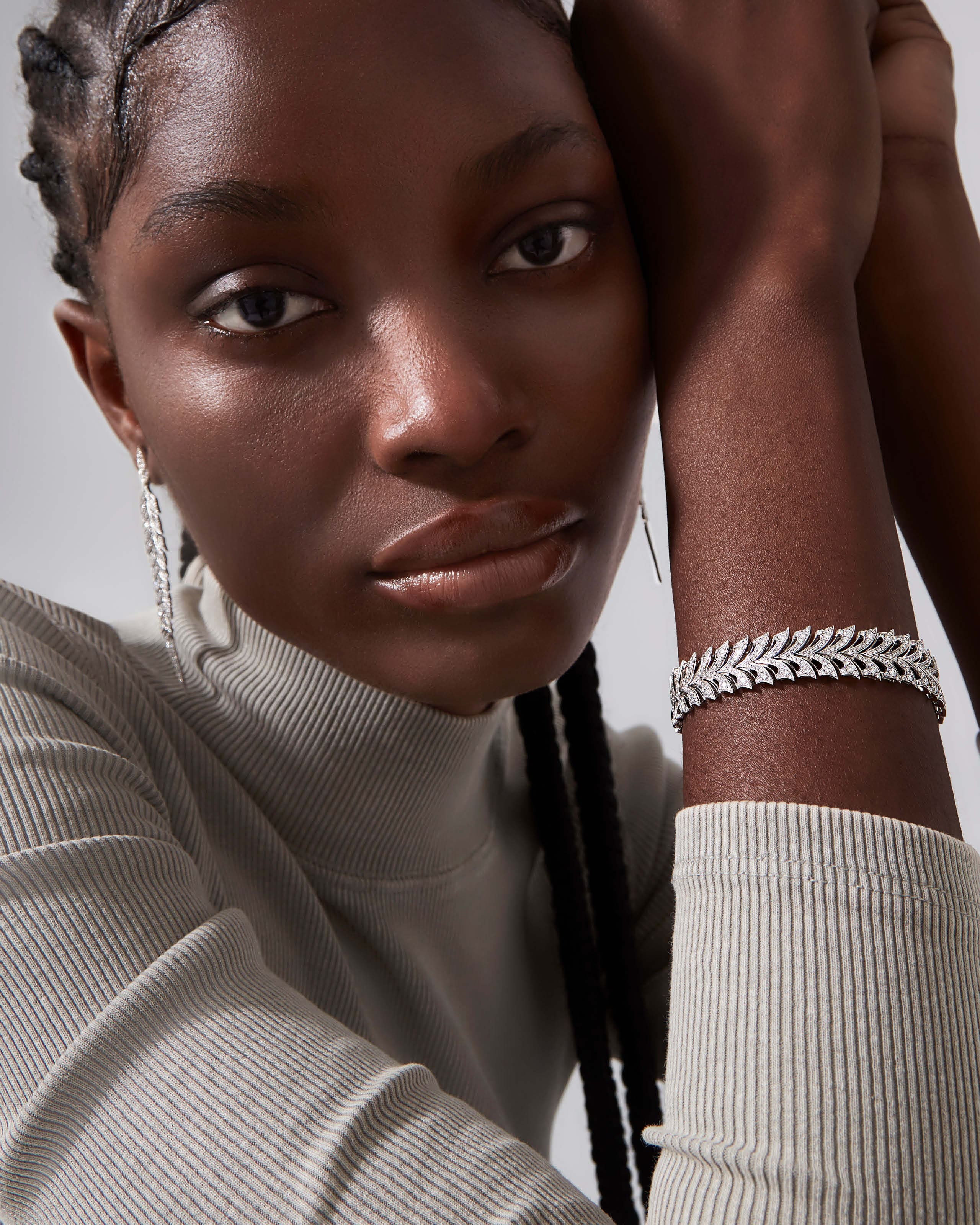 The Open Plume Slimline Linked Bracelet features intricately articulated feather segments set in a White Diamond pavé for a spectacular piece, inspired by the English gamebird, the pheasant.