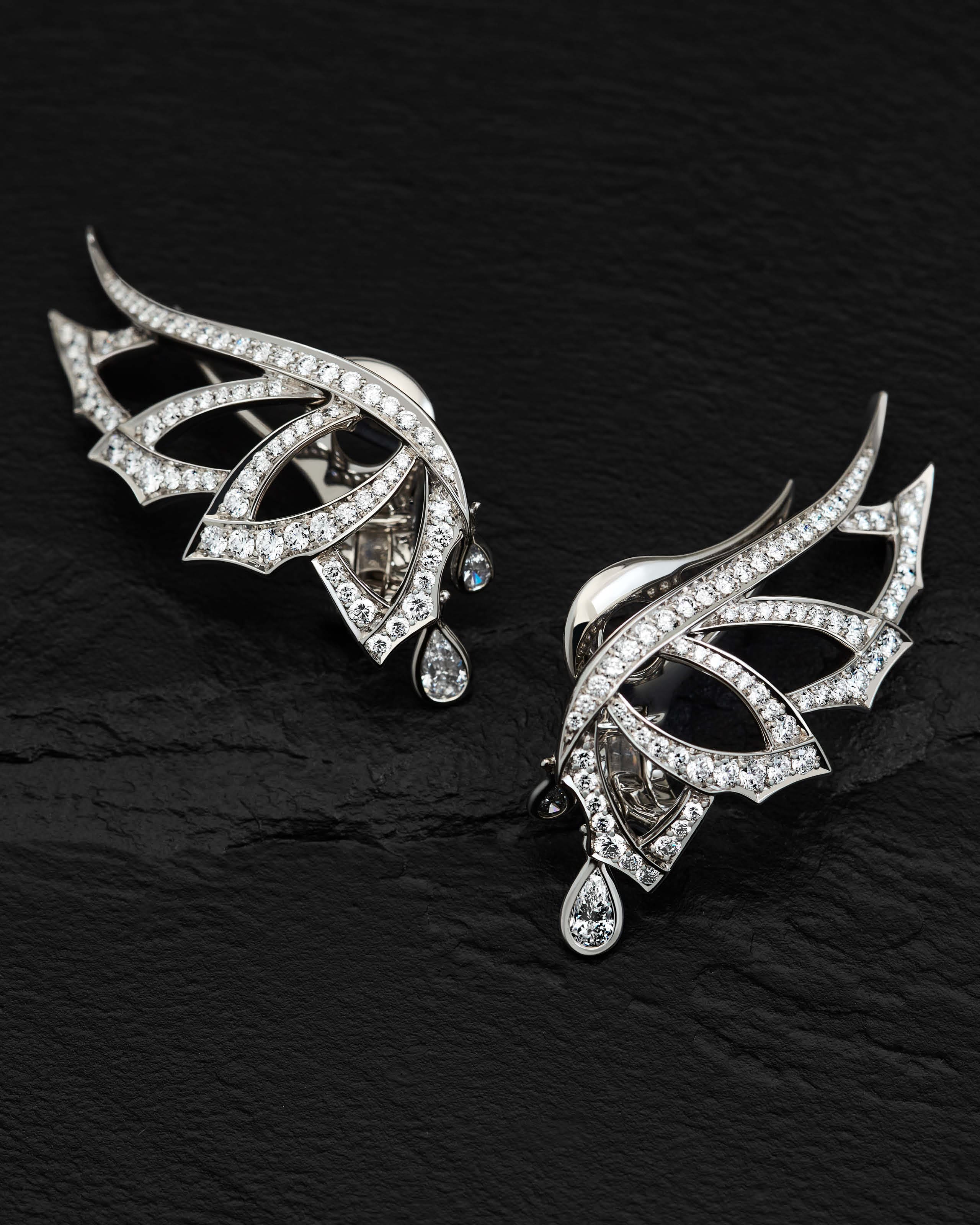 Depicting the pheasants spectacular feathers outstretched, the Magnificent Open Plume Ear Cuffs set with White Diamond pavé and pear shaped White Diamonds drops, are a striking pieces for a day to night look.