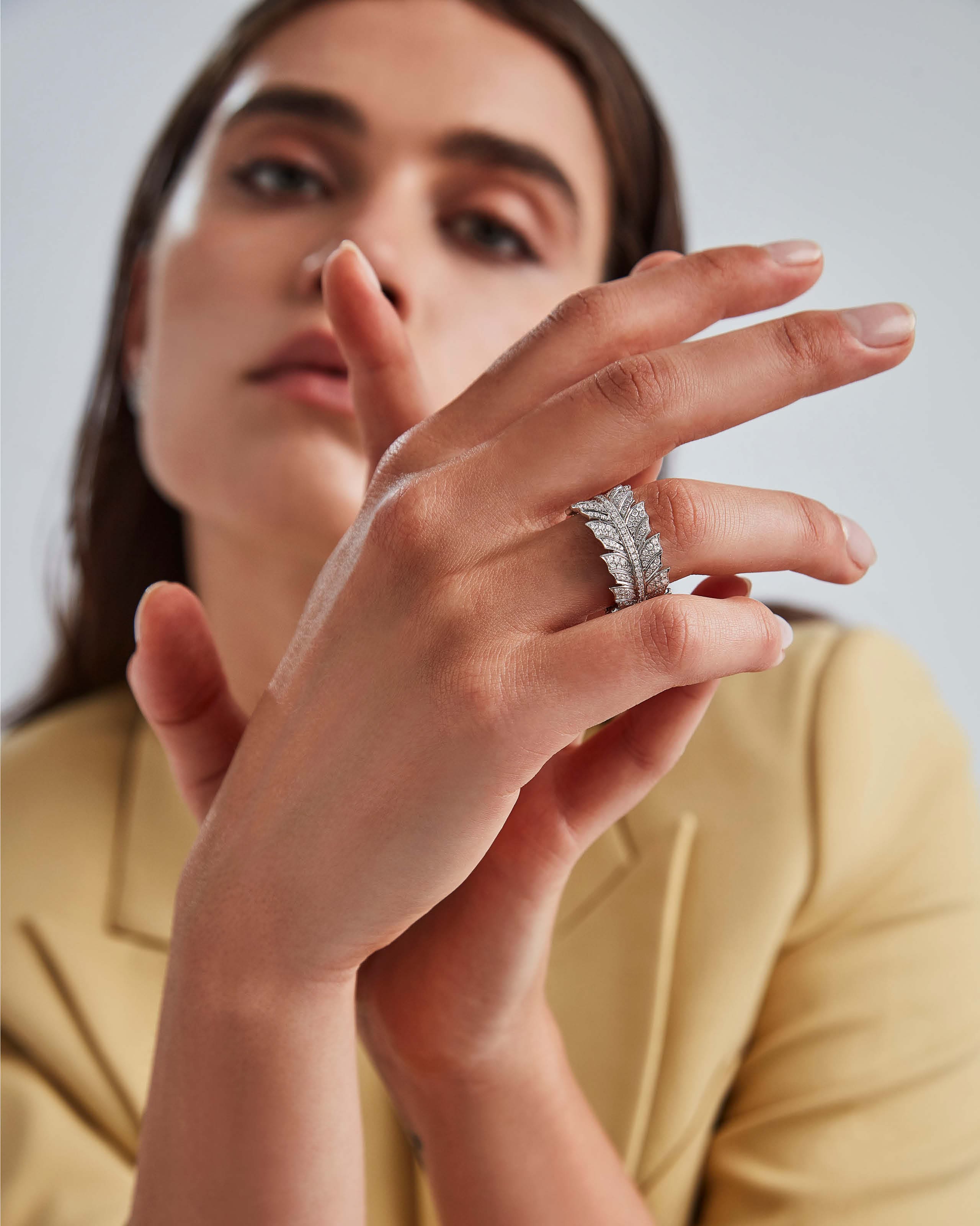 The majestic Eternal Plume Band Ring is an eternity band like no other, set with a mesmerising White Diamond pavé with intricate feather detail.