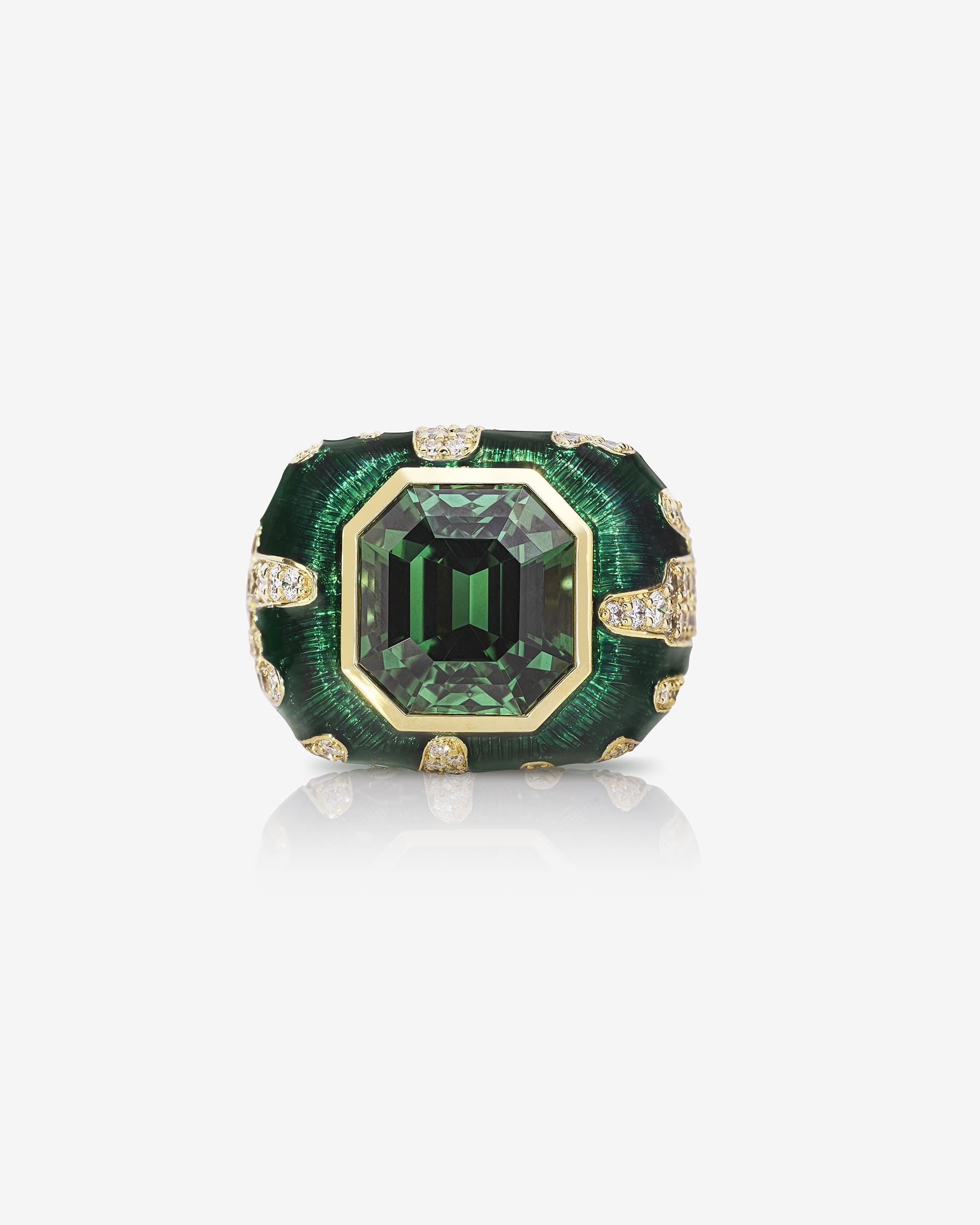 Showcasing the ‘Full Bleed’ ring with a central Afghan bi-colour Blue - Green Tourmaline and enamel, set with graduating Brown and White Diamonds and crafted in 18 carat Yellow Gold.