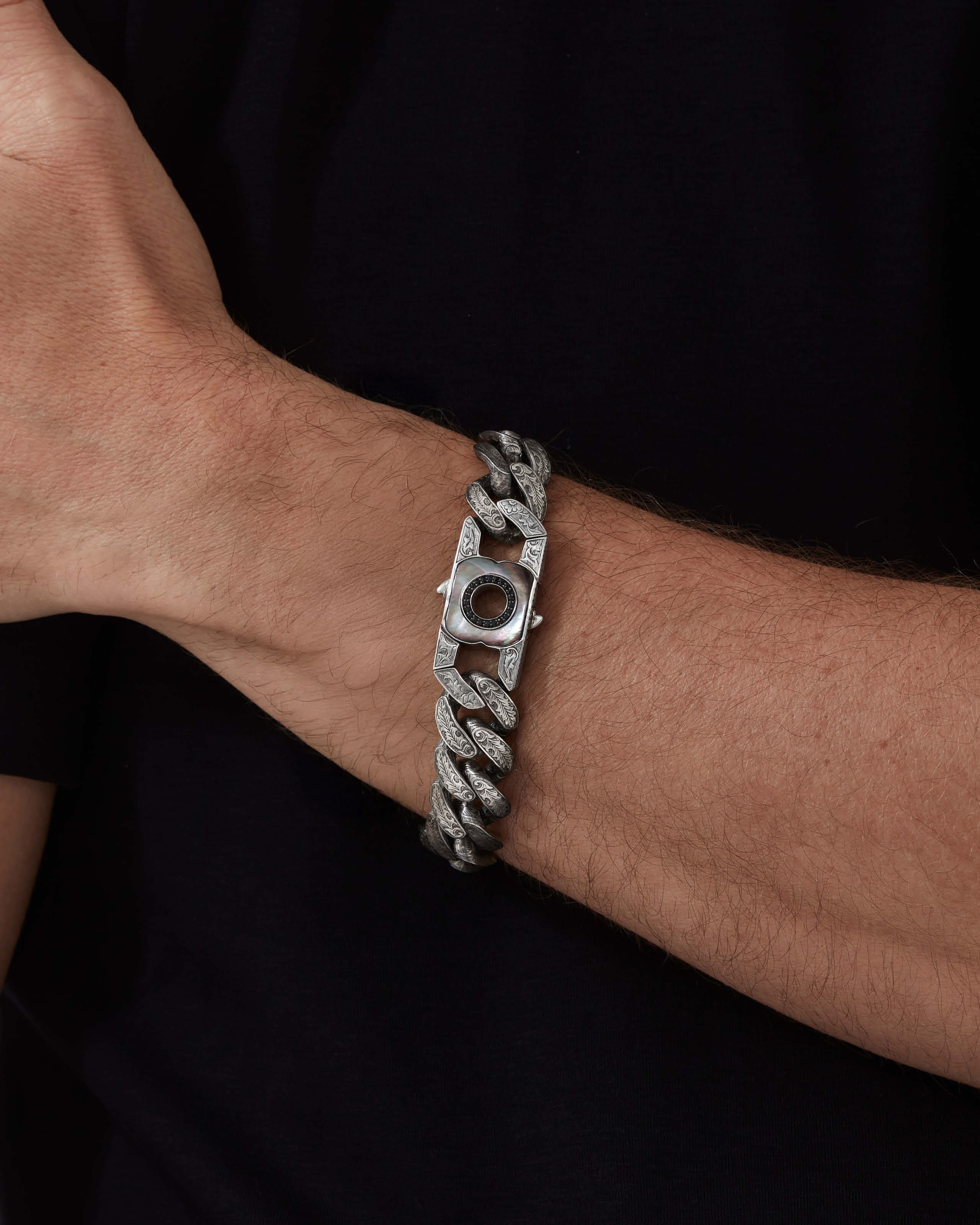 • Model wearing Stephen Webster 18 mm Cuban Leaf Bracelet in sterling silver