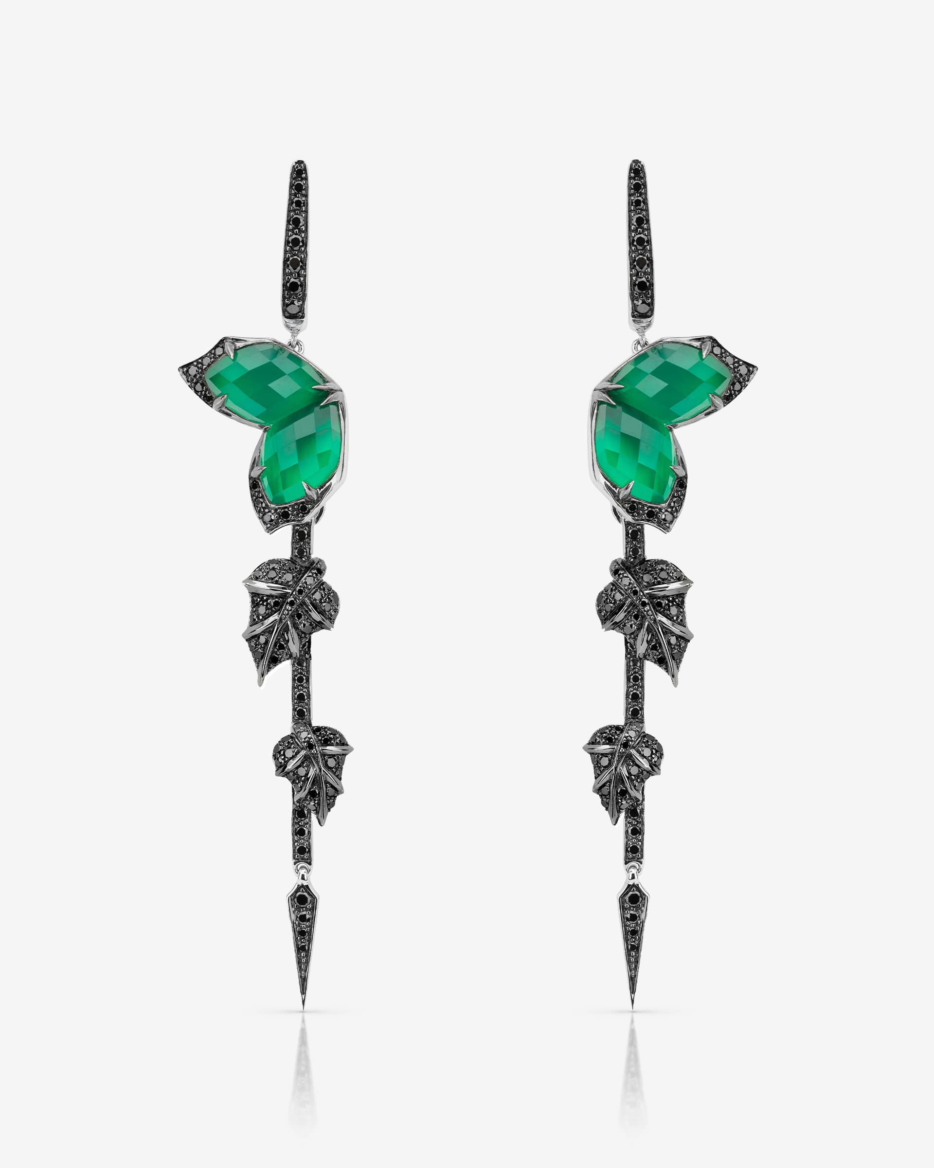 Pick a petal off the 'Love Me, Love Me Not' Long Earrings to twist your fate in your favour. Handcrafted in 18ct white gold set with green agate and clear quartz Crystal Haze and black diamond pavé.