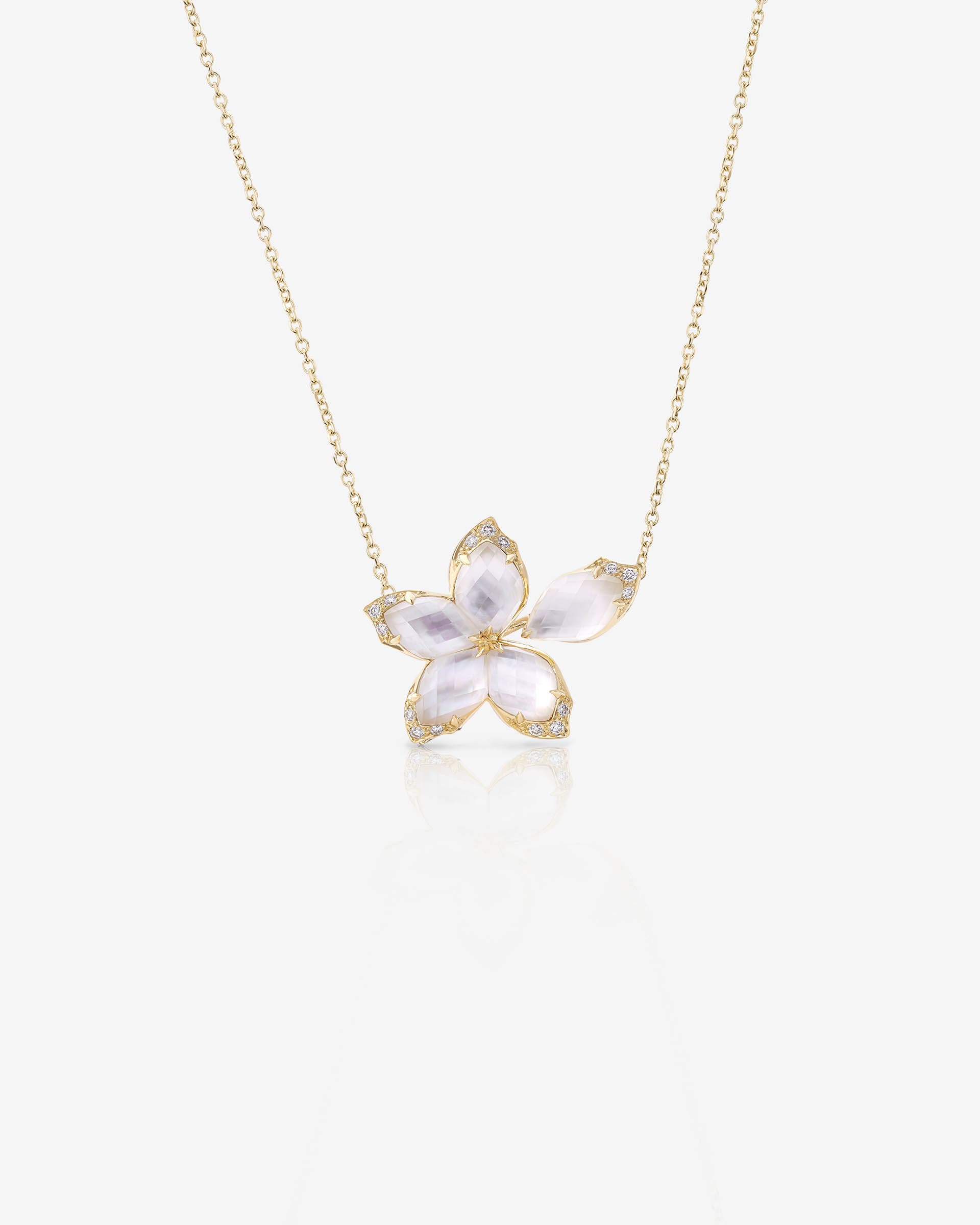 Twist the fate of predicting feelings through picking the right petal with the 'Love Me, Love Me Not' Small Pendant. Meticulously handcrafted in 18ct yellow gold set with white mother of pearl and quartz Crystal Haze and white Diamond pavé.