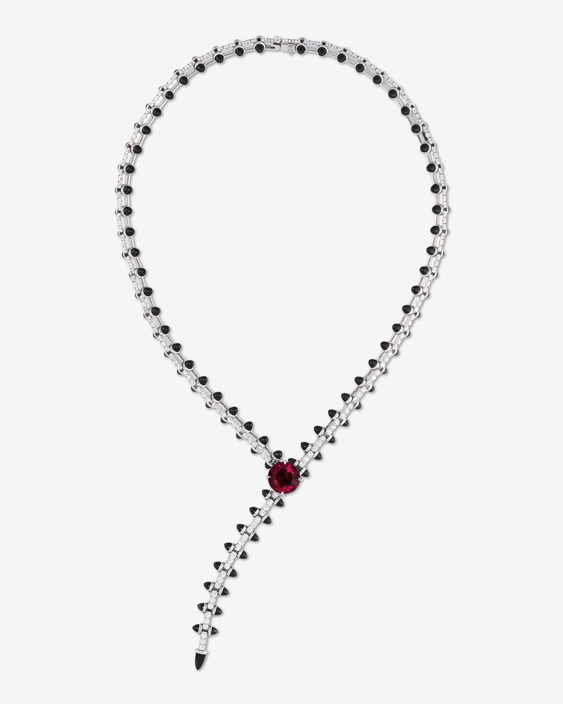 Depicted for the first time in a monochrome pallet, the Russian Roulette Collar features a spectacular central Rubellite with Onyx bullets and white Diamonds along the collar, all set in 18ct white Gold.