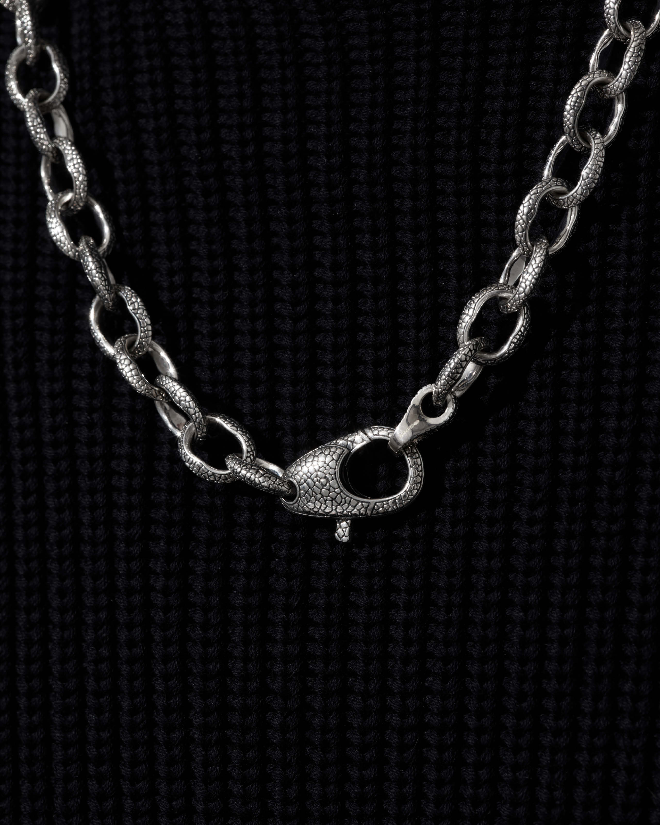The Sterling Silver Rayman Chain features textured Rayskin oxidised Silver links on a 24-inch chain length.