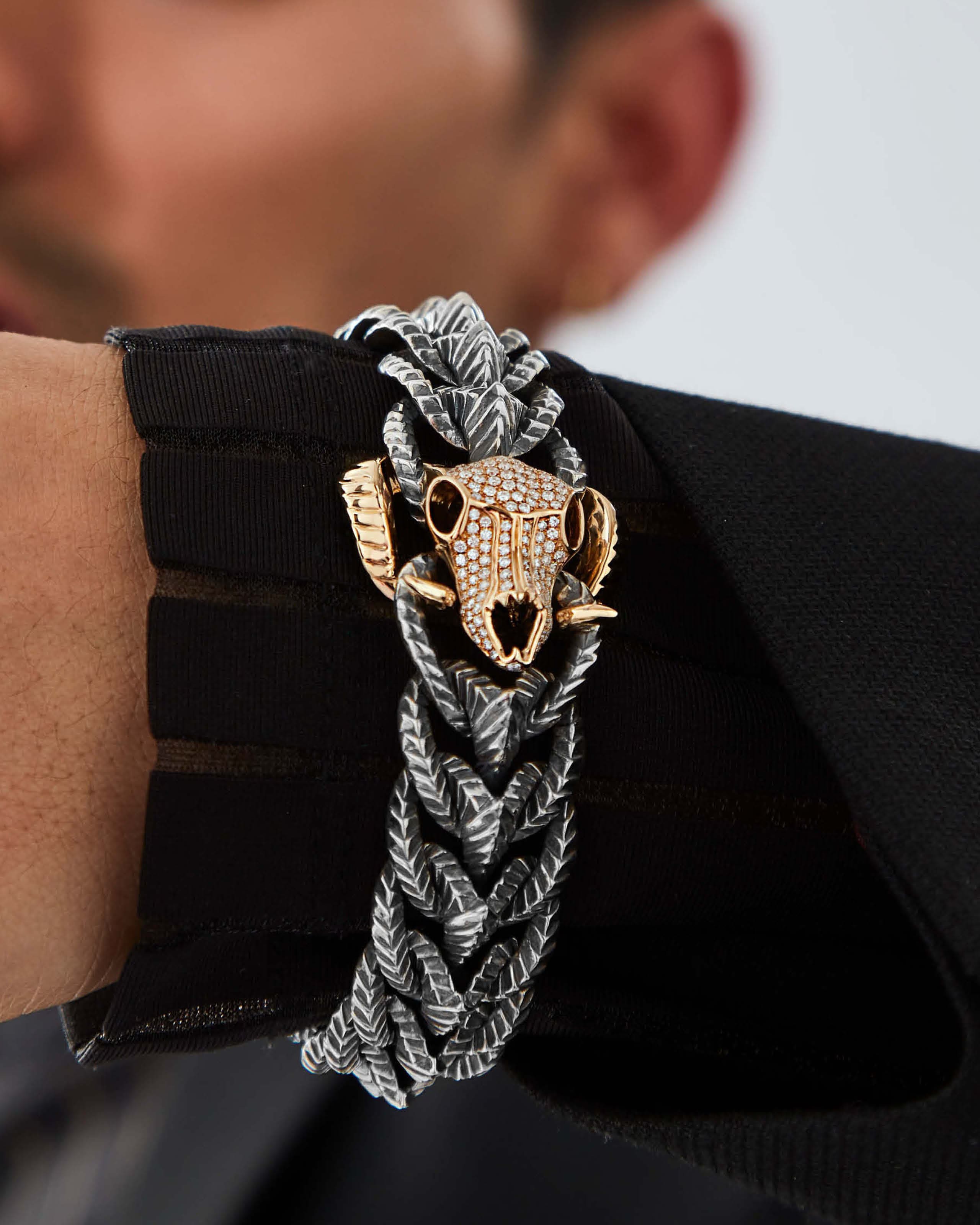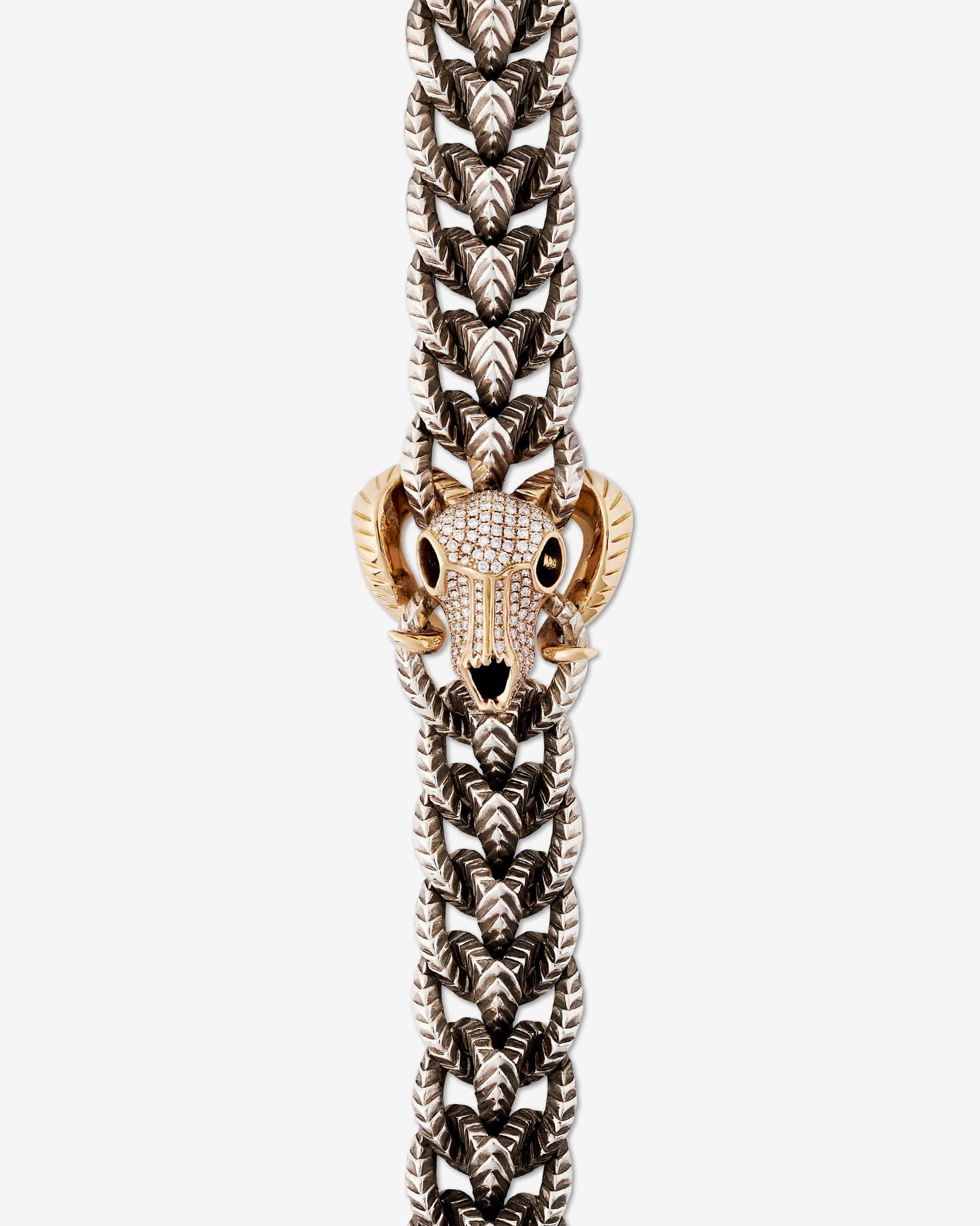 Predominantly Sterling Silver, the centrepiece Rams skull is fully set with white Diamond pavè set in 18ct yellow Gold.