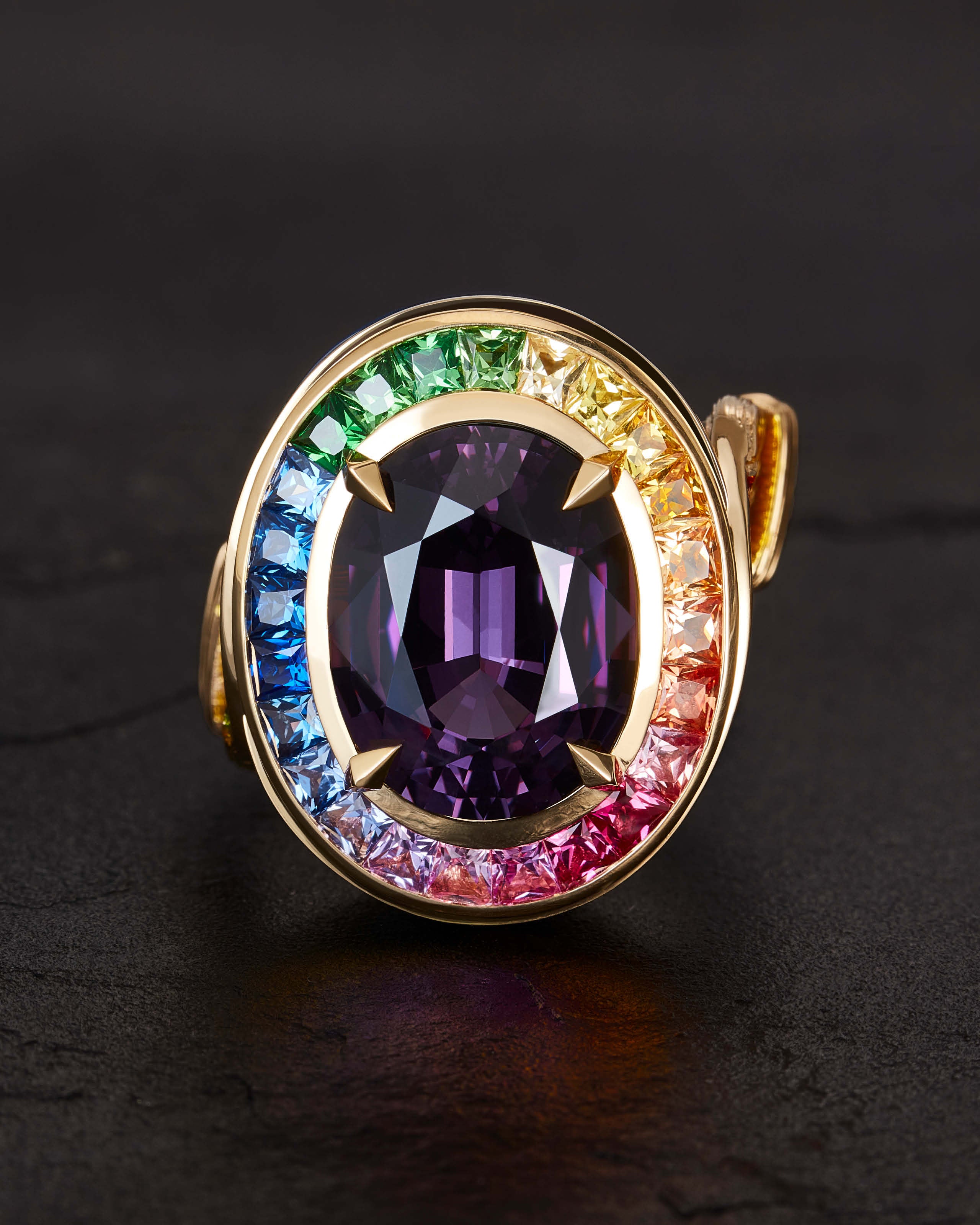 Set in 18ct Yellow Gold with a central Lilac Spinel surrounded by a rainbow of square cut Sapphires and Tsavorites, that represent Martha’s flamboyant wardrobe. Finished with graduated, Rainbow coloured, cold enamelling depicted in paint strokes that dance around the central stone, creating the illusion that the ring is painting itself.