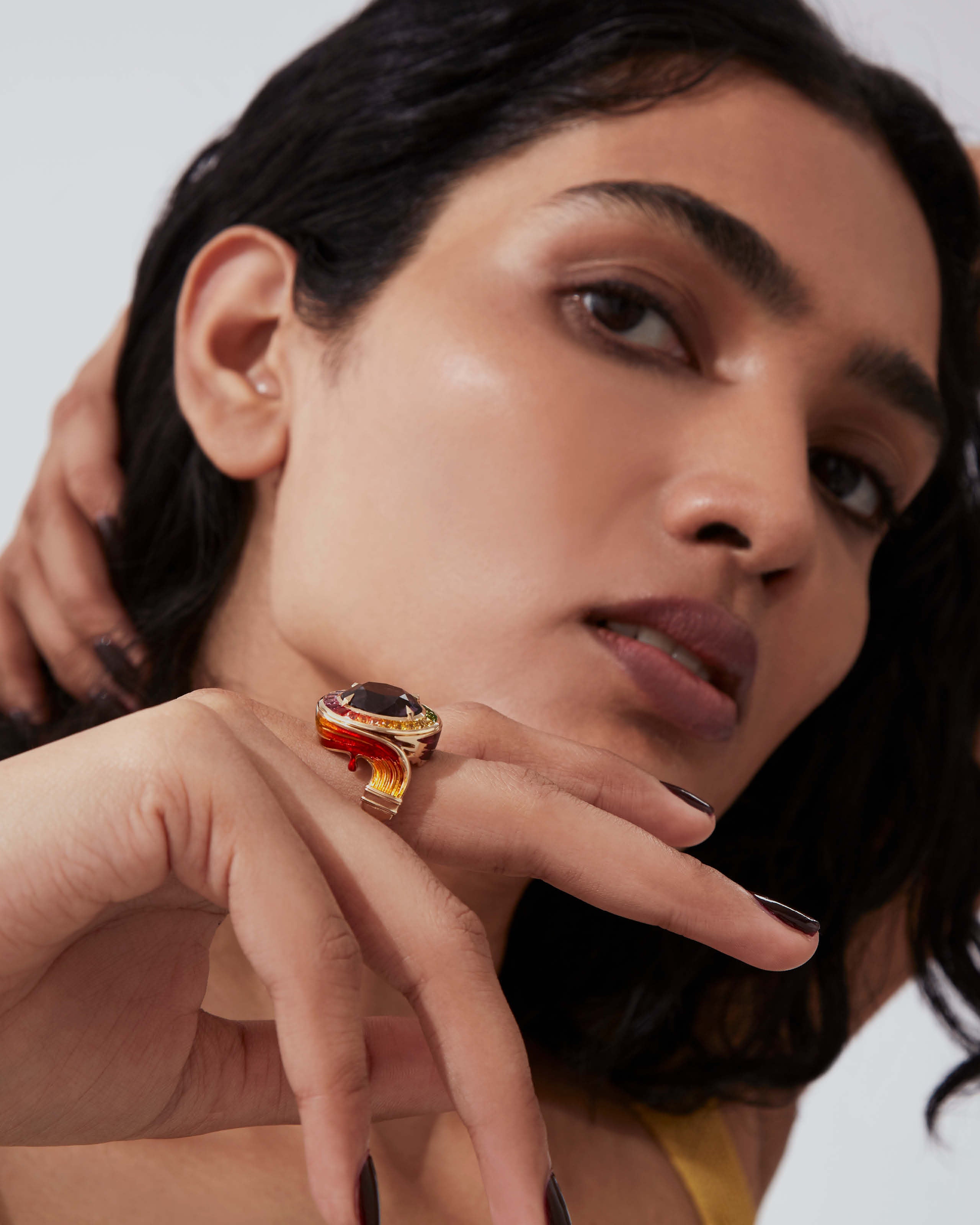 • Model wearing Joie De Vivre ReBelles ring — yellow-gold cocktail ring with lilac spinel and rainbow gemstones