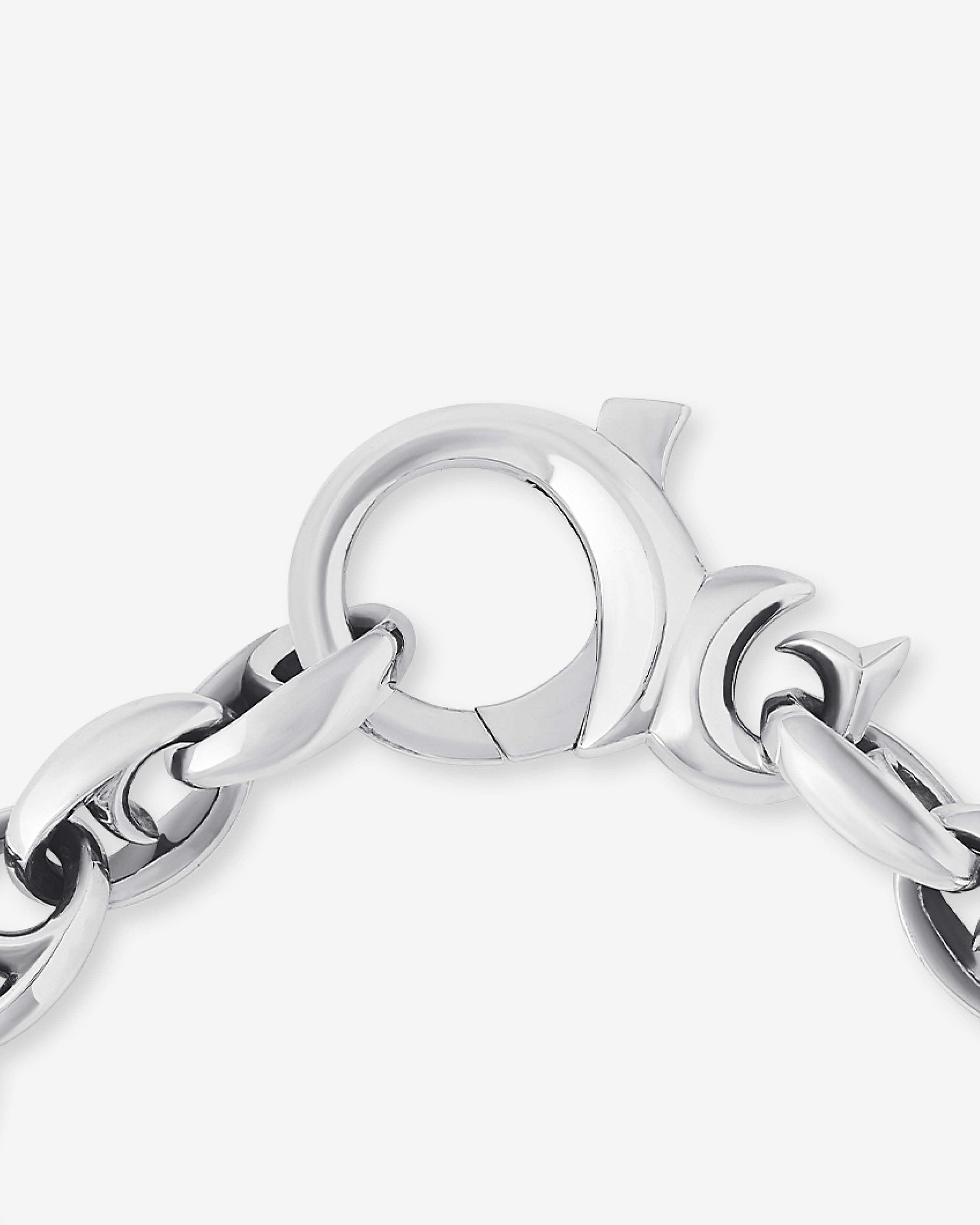 • Close-up detail of the thorn-inspired medium oval links and polished sterling silver finish on Stephen Webster bracelet