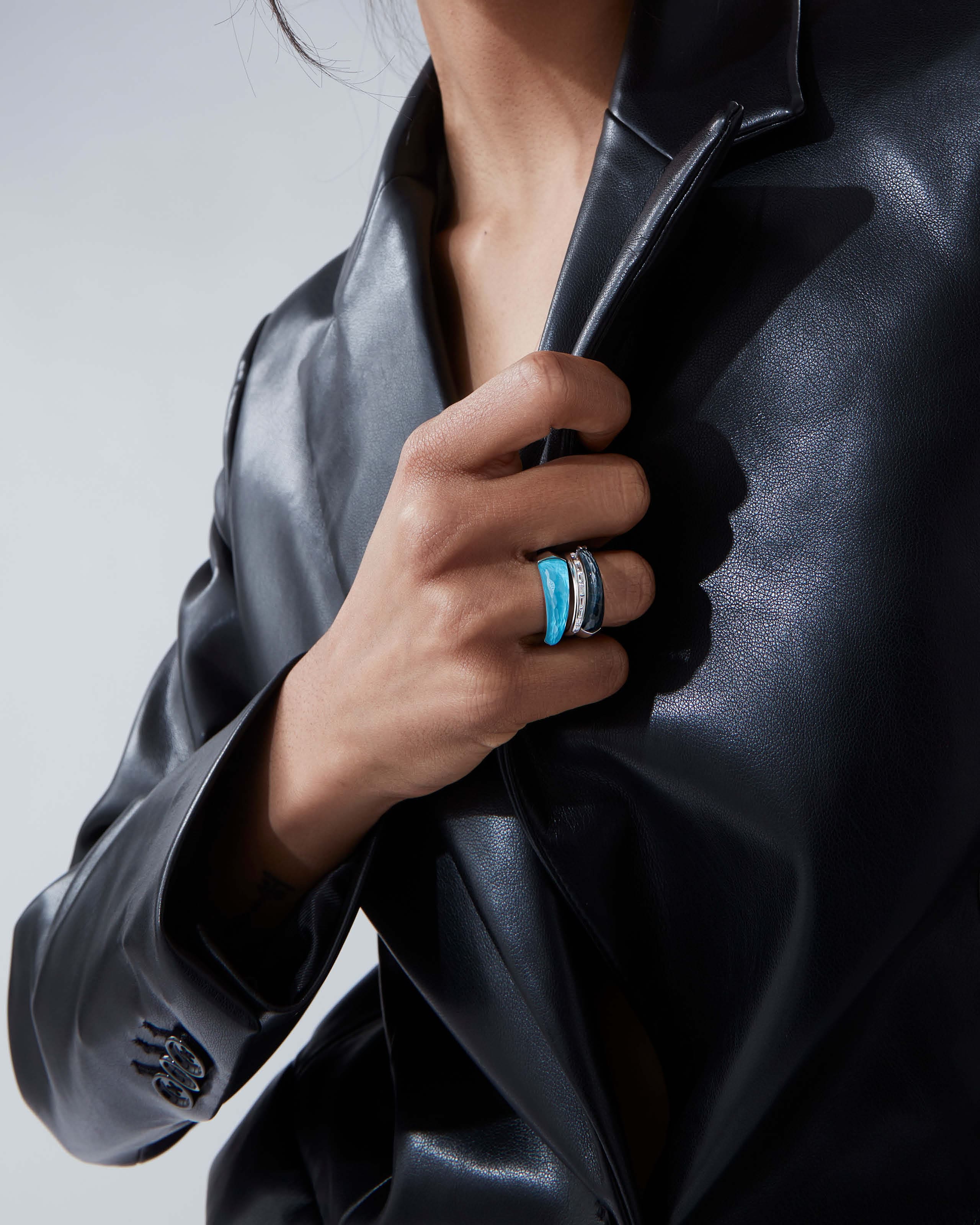Opt for a monochrome look with the Falcon's Eye Crystal Haze Slimline Stack Ring. Style with the Baguette Stack Ring with White Diamonds for maximum impact.