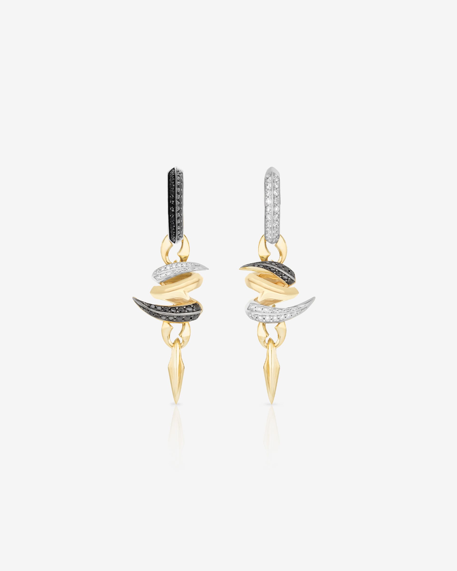 Knotted thorns glamorously form the Entwined Drop Earrings, crafted from 18ct recycled Yellow and White Gold and set with captivating White and Black Diamond pavé.