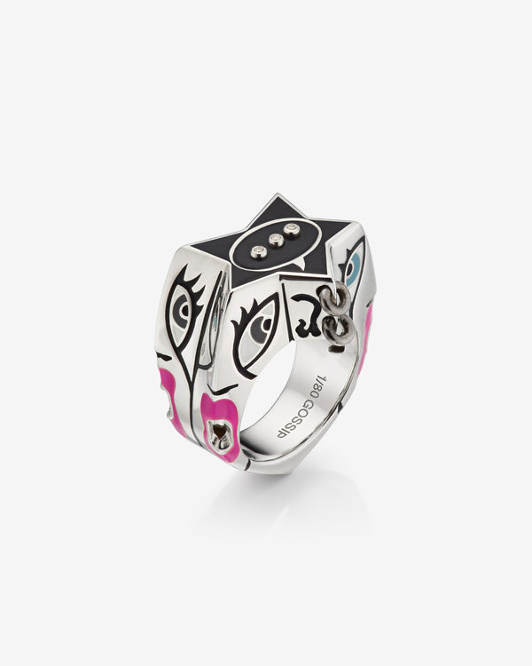 Limited to a total production of 640 pieces, across 8 colour editions, the GOSSIP Ring in Sterling Silver is visualised with three dimensional mouths, eyes and ears captured midst careless whisper. With social media often the culprit for amplifying hearsay, messenger speech bubbles are incorporated into the design showcased on top of the ring.
