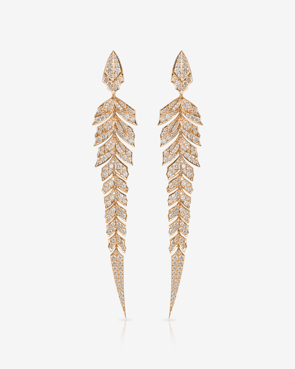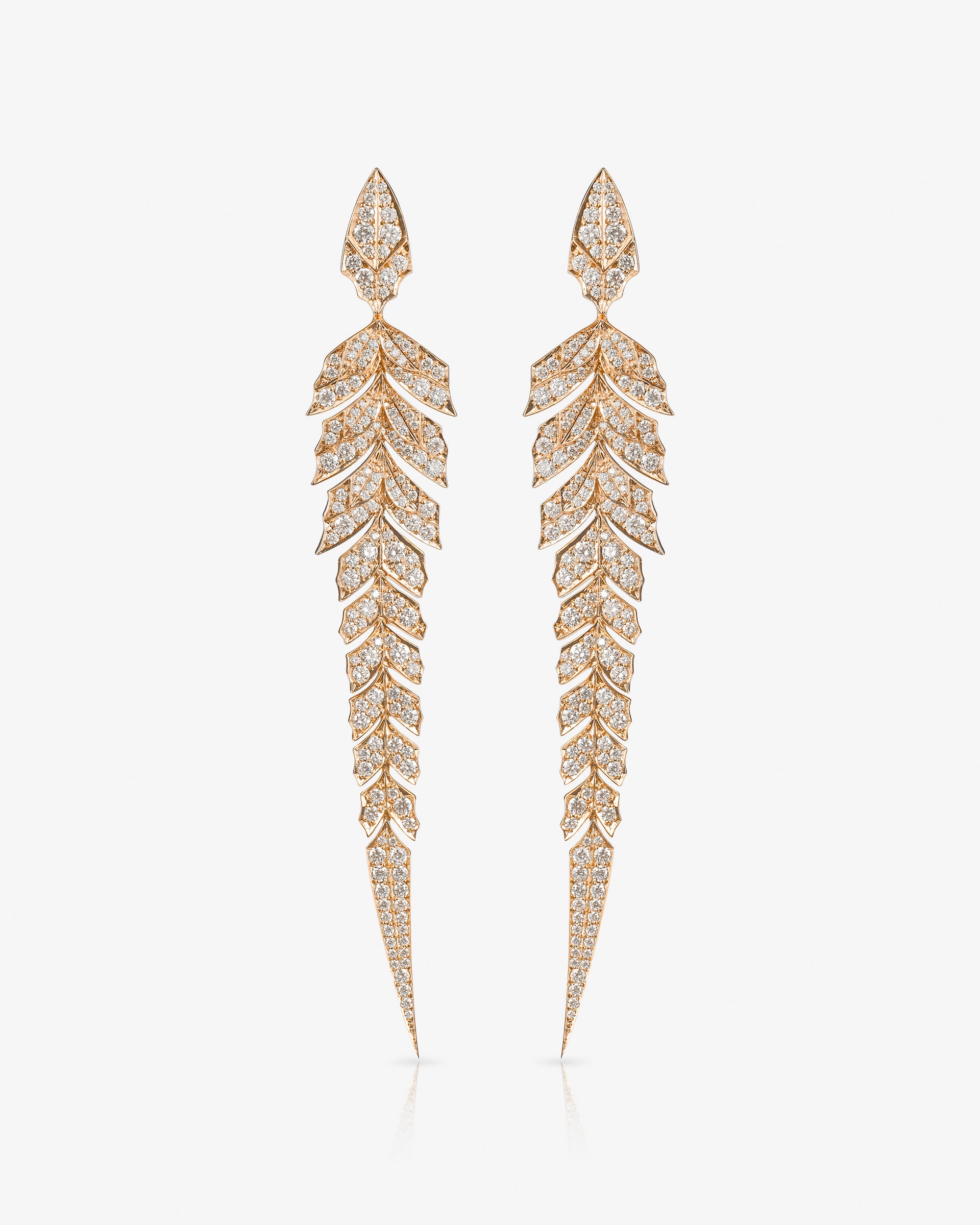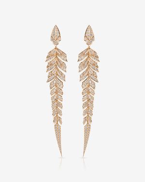 The timeless and glamorous Tail Feather Long Drop Earrings embody the magnificent pheasant's tail set with White Diamond pavé on articulated feather segments for alluring movement.