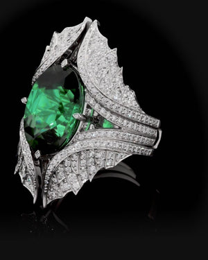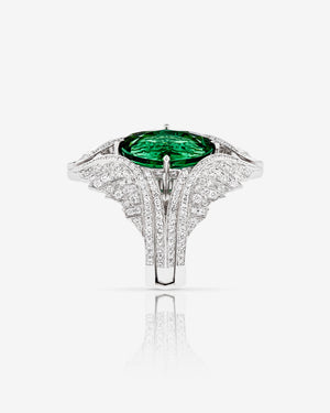 Set in 18ct White Gold with a central Green Dichroic Tourmaline and White Diamonds. The central Tourmaline is as diverse as the dancer it is inspired by and can be removed and worn alone; or with the jacket representing the powerful wings of a Swan and drama that is Anna Pavlova.
