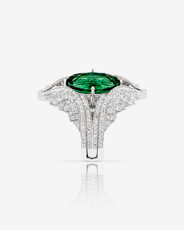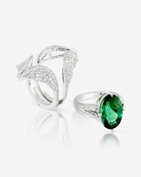 • Model wearing Swan Song ReBelles ring — 18 ct white-gold ring with green tourmaline and diamonds