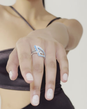 Acutely glamorous, the Vertigo Obtuse Ring is crafted in 18ct White Gold featuring shards of Neon Blue enamel, with white baguette Diamonds and white Diamond pavé.