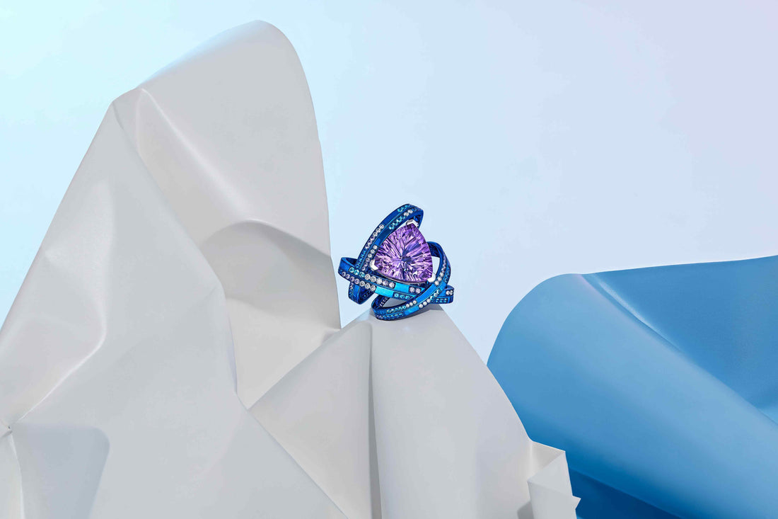 The Rocket Girl ReBelle is something completely out of this world featuring a central Trillion Dynimite cut Amethyst which sits surrounded by continuous Blue Titanium and 18ct white Gold. Bejewelled with Paraiba Tourmalines, Diamonds, purple and blue Sapphires presented in a the form of a mathematical code, drawing inspiration from Johnsons brain incredible intelligence.