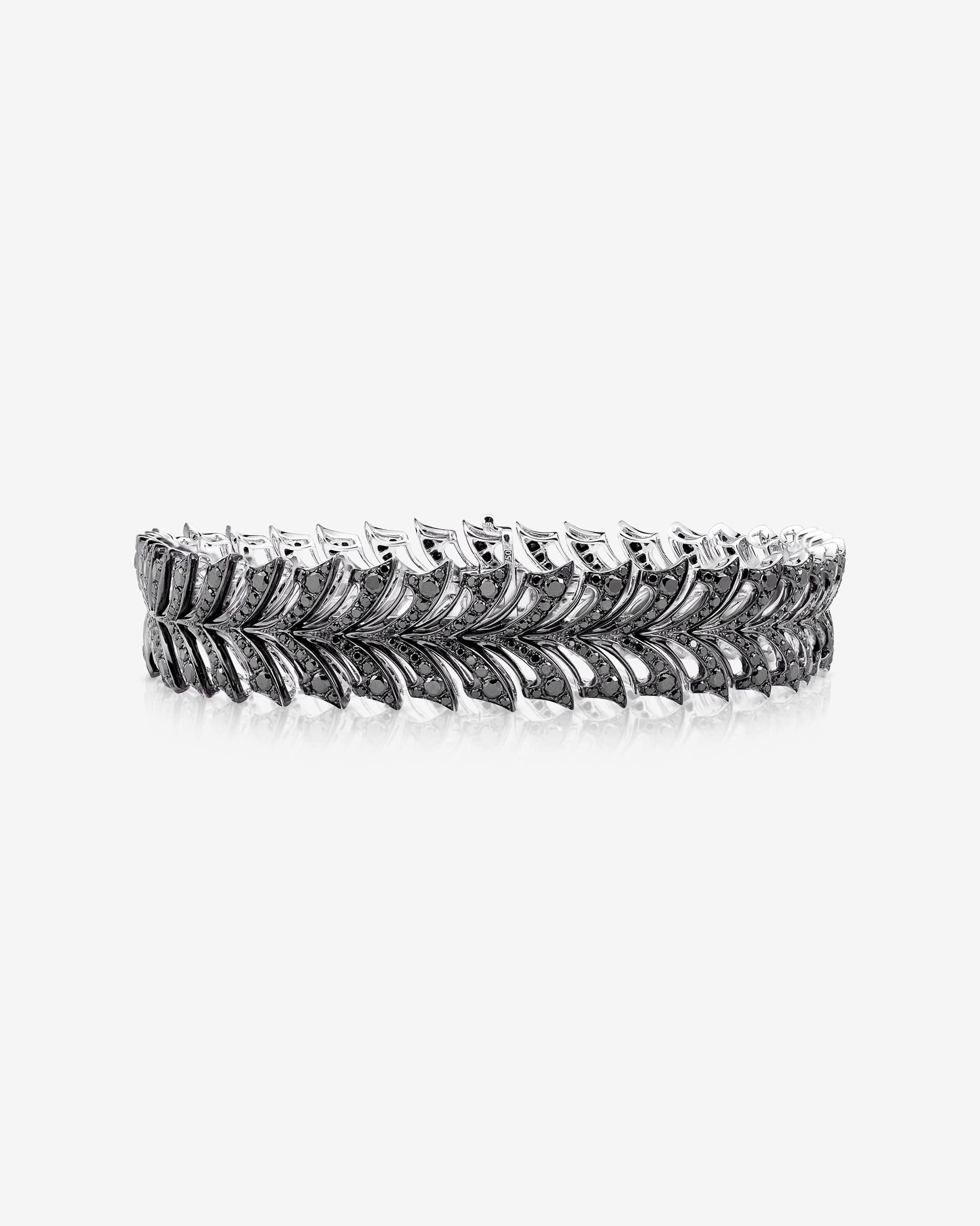 The Open Plume Slimline Linked Bracelet features intricately articulated feather segments set in a Black Diamond pavé for a spectacular piece, inspired by the English gamebird, the pheasant.