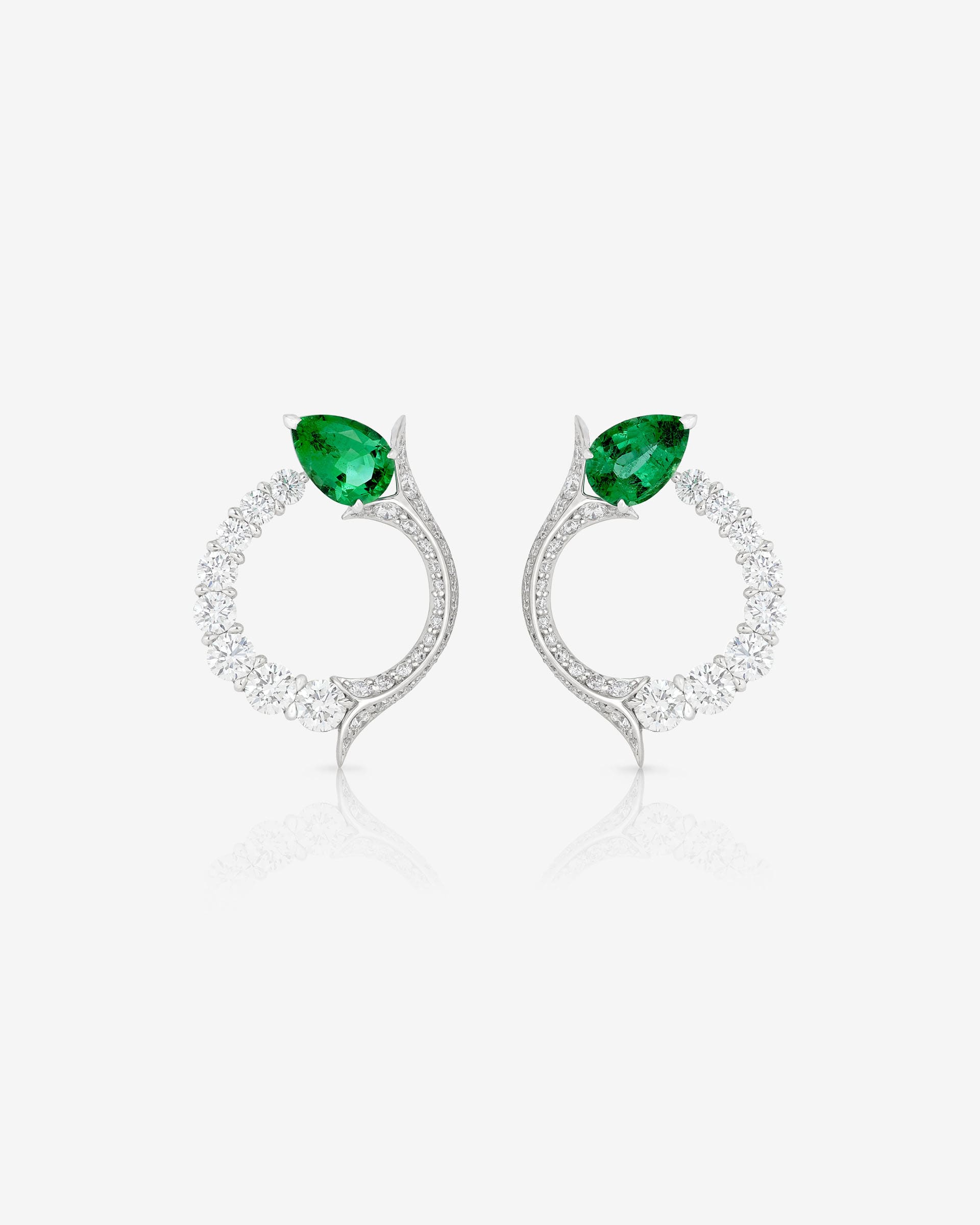 Best of both worlds, the natural yet dramatic contrast of the pear-shaped Emeralds elevates the Inner Circle Earrings into an otherworldly experience, all set in recycled 18ct white Gold surrounded by round and pavé White Diamond thorns.