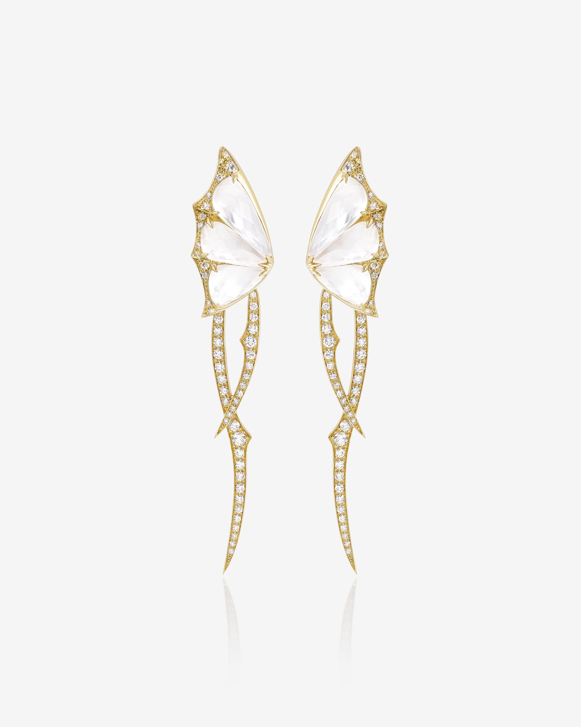 Take your look from day to night with the versatile Winged Detachable Drop Earrings set with White Mother of Pearl and Quartz Crystal Haze with White Diamond pavé.