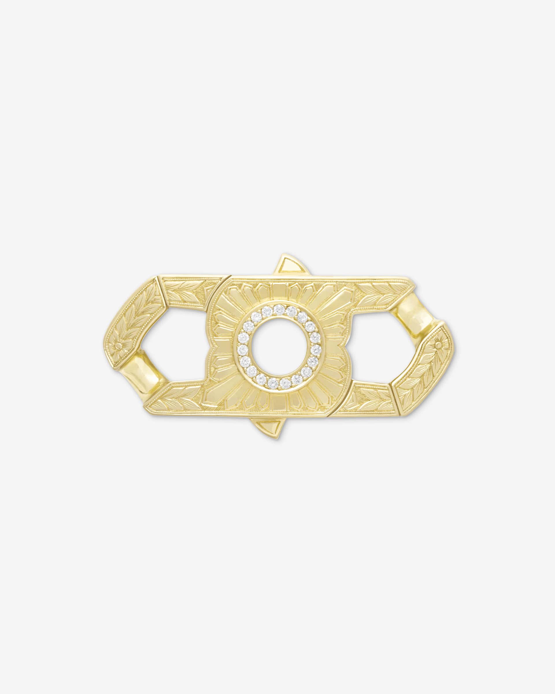 Our Churchill Clasp is crafted from 18ct Yellow Gold and set with White Diamond pavè, finished with a White Mother of Pearl inlay on the underside of the clasp. Finished with an engraved motif modelled on a cigar cutter.