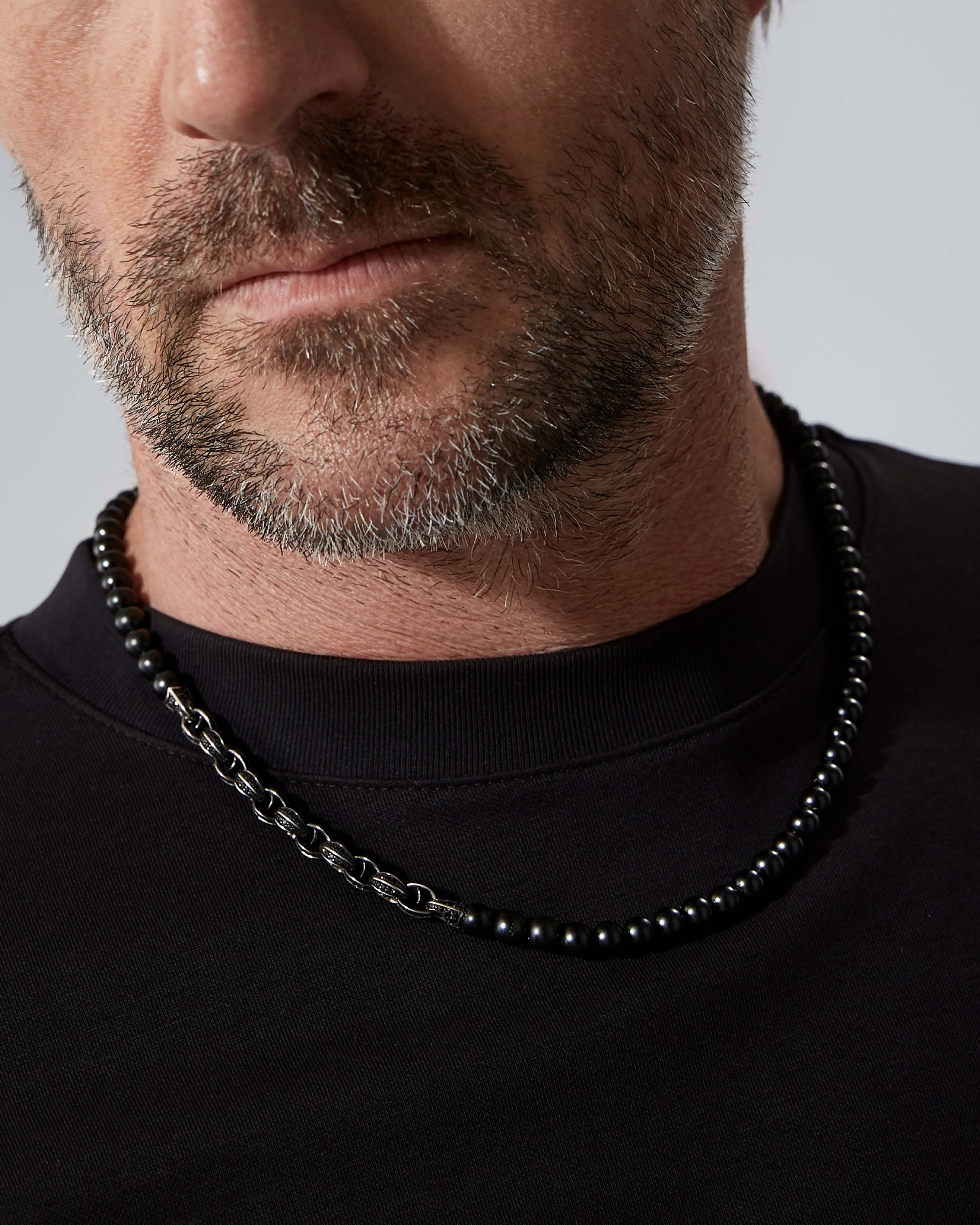 Adding a pop of glamour the Thorn Beaded Necklace features Matt Black Onyx beads and Sterling Silver thorn links which are set with black Sapphires.