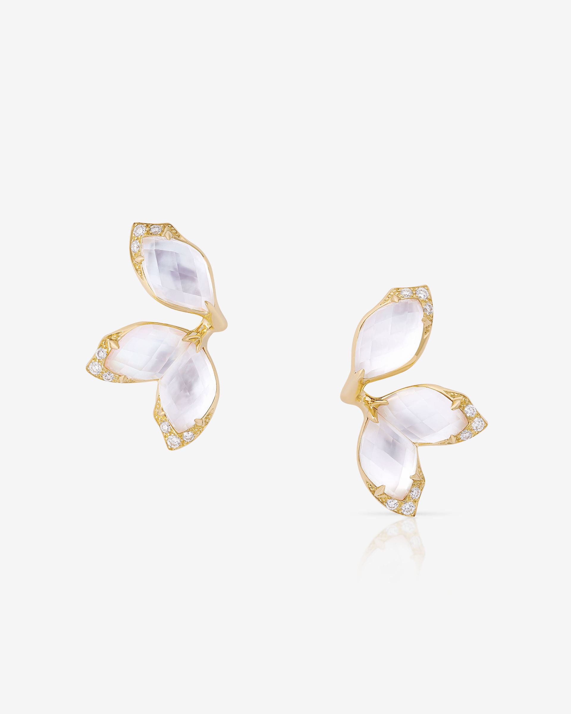 Inspired by the ultimate game of chance, the Crystal Haze Chance Earrings, are handcrafted from 18ct Yellow Gold, with White Mother of Pearl Crystal Haze and White Diamond pavé.