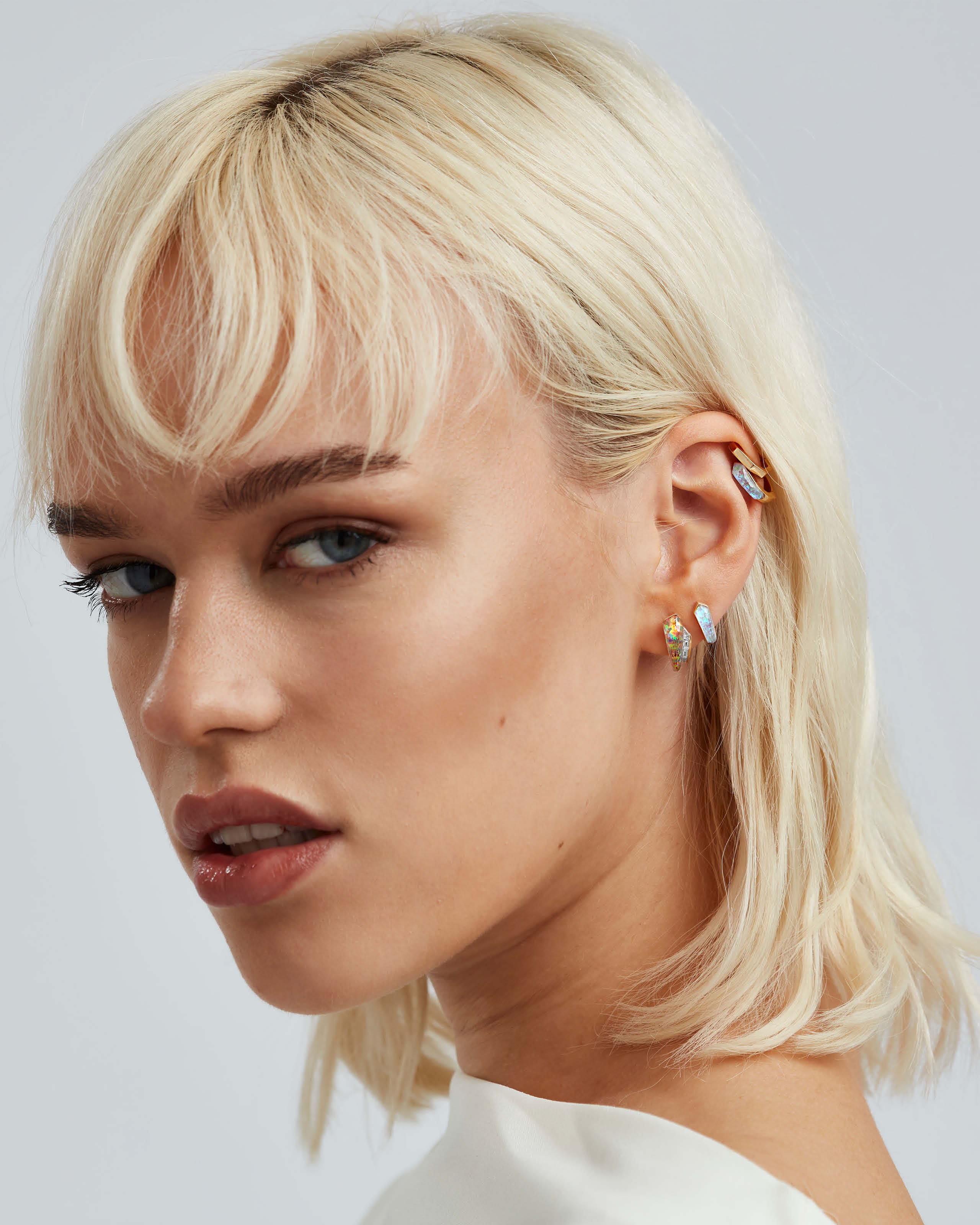 The facets on the Quartz allows light to enter at hundreds of different angles, producing a holographic ‘haze’ of colour that moves as the jewellery is worn.