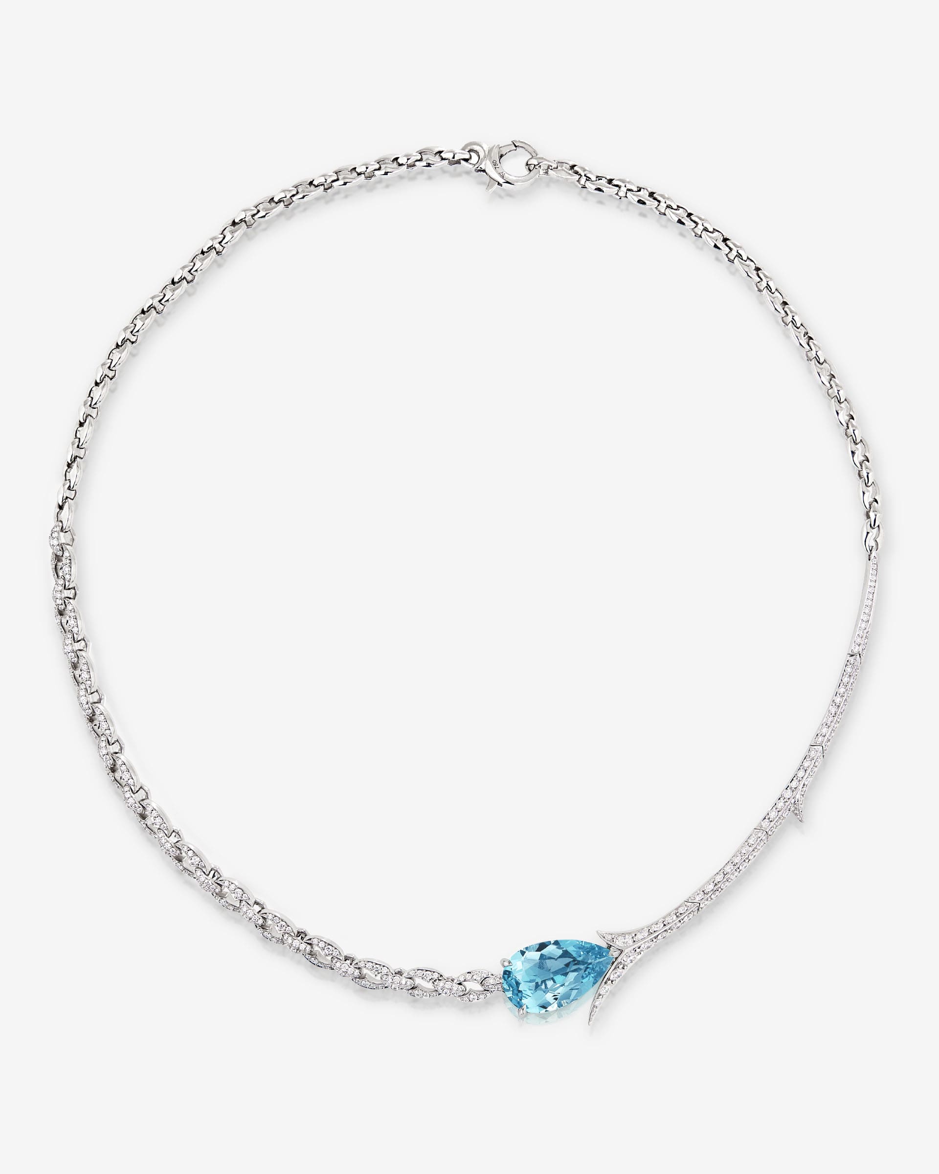 Alluringly tempting, the Tear Drop Necklace features a pear-shaped Aquamarine erupts from a chain of White Diamond pavé thorns, celebrating a new era of modern romance.