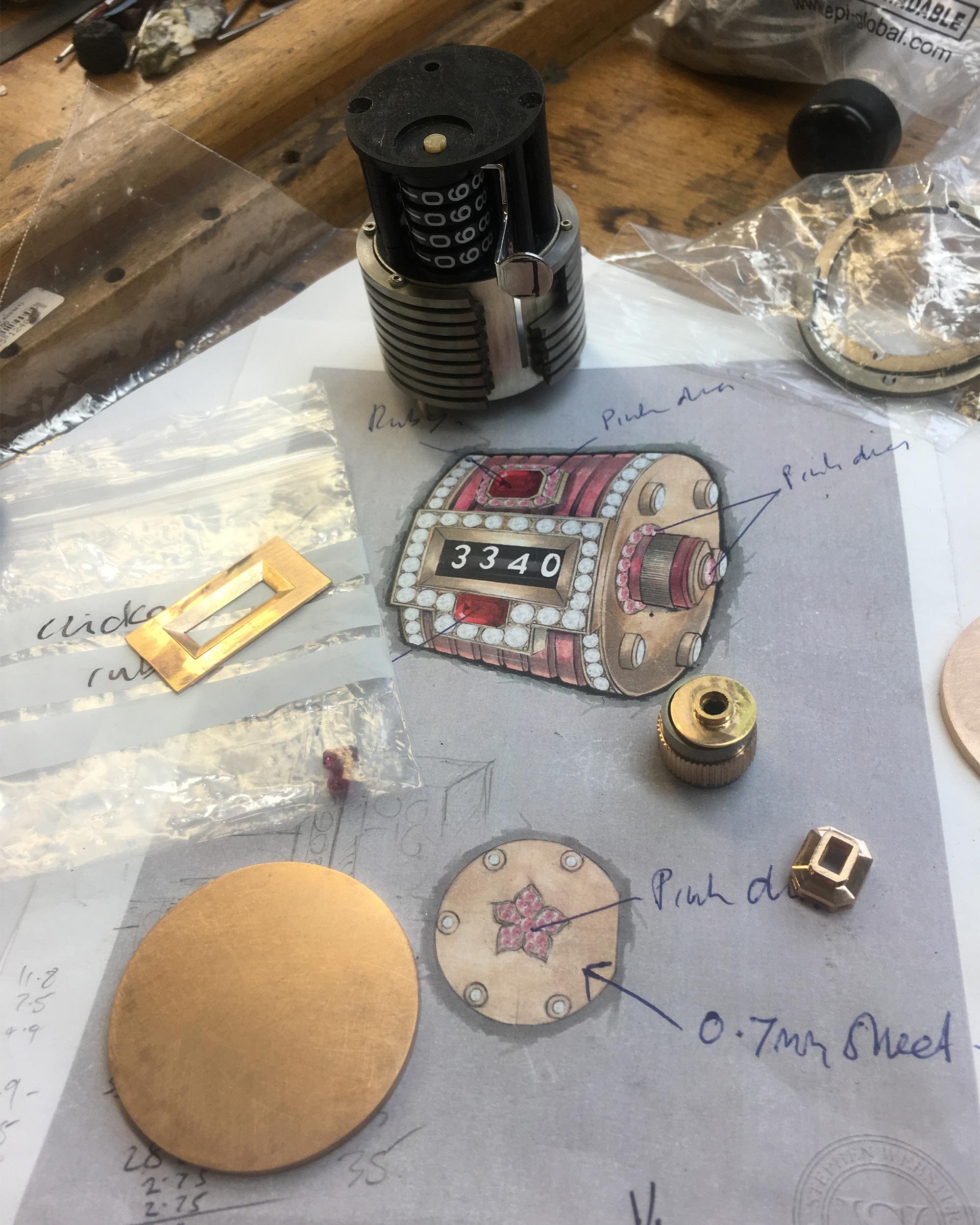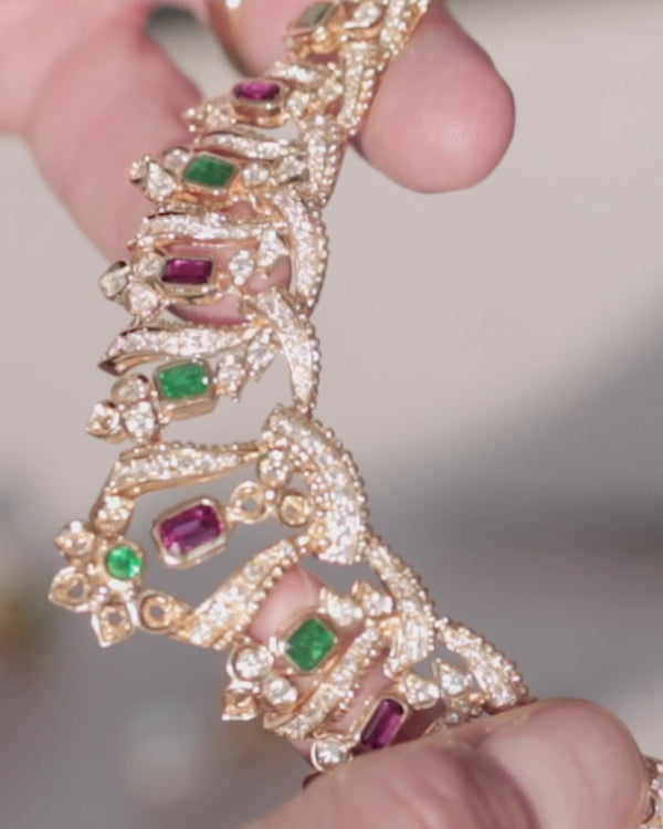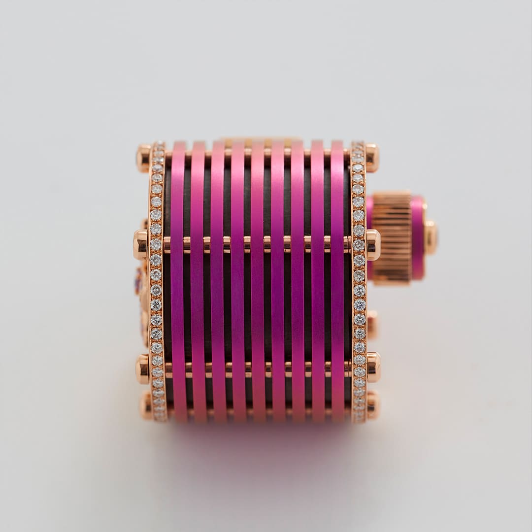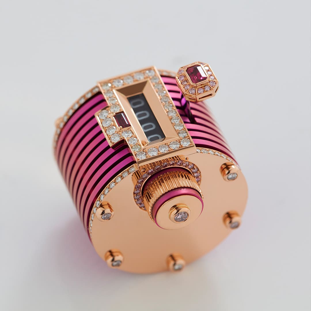 The mother brought in a gold necklace set with diamonds, rubies, and emeralds that she no longer wore. The re-design process started with Stephen Webster analysing the materials and carefully dismantling each stone. Our master craftsmen then deconstructed and reworked the necklace to create a 18ct Rose Gold and Pink Titanium counter, with Diamond and Ruby detailing.