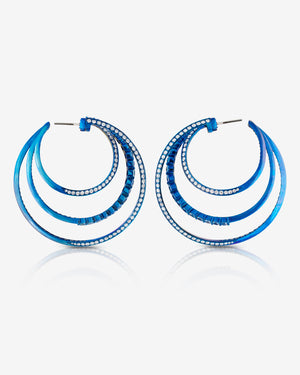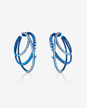 Dangerously alluring; the Unraveled Hoop Earrings are innovatively crafted in lightweight electric blue Titanium and set with oval faceted light blue Sapphires and White Diamond pavé.
