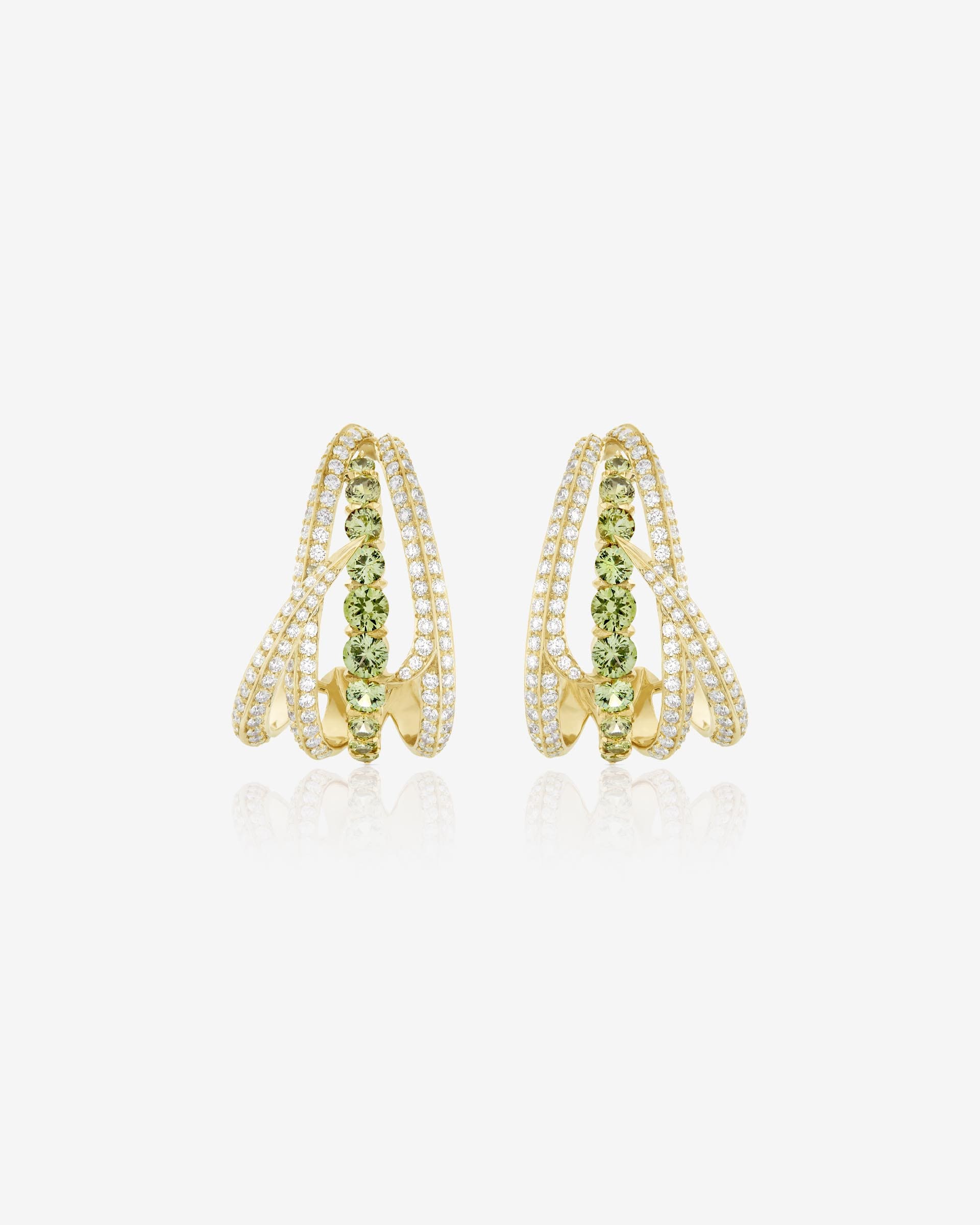 Dramatic pairings of mint green Demantoid Garnets and White Diamond pavé thorns form the Bound Together Gem Earrings, crafted in 18ct Yellow Gold for a glamourous look.